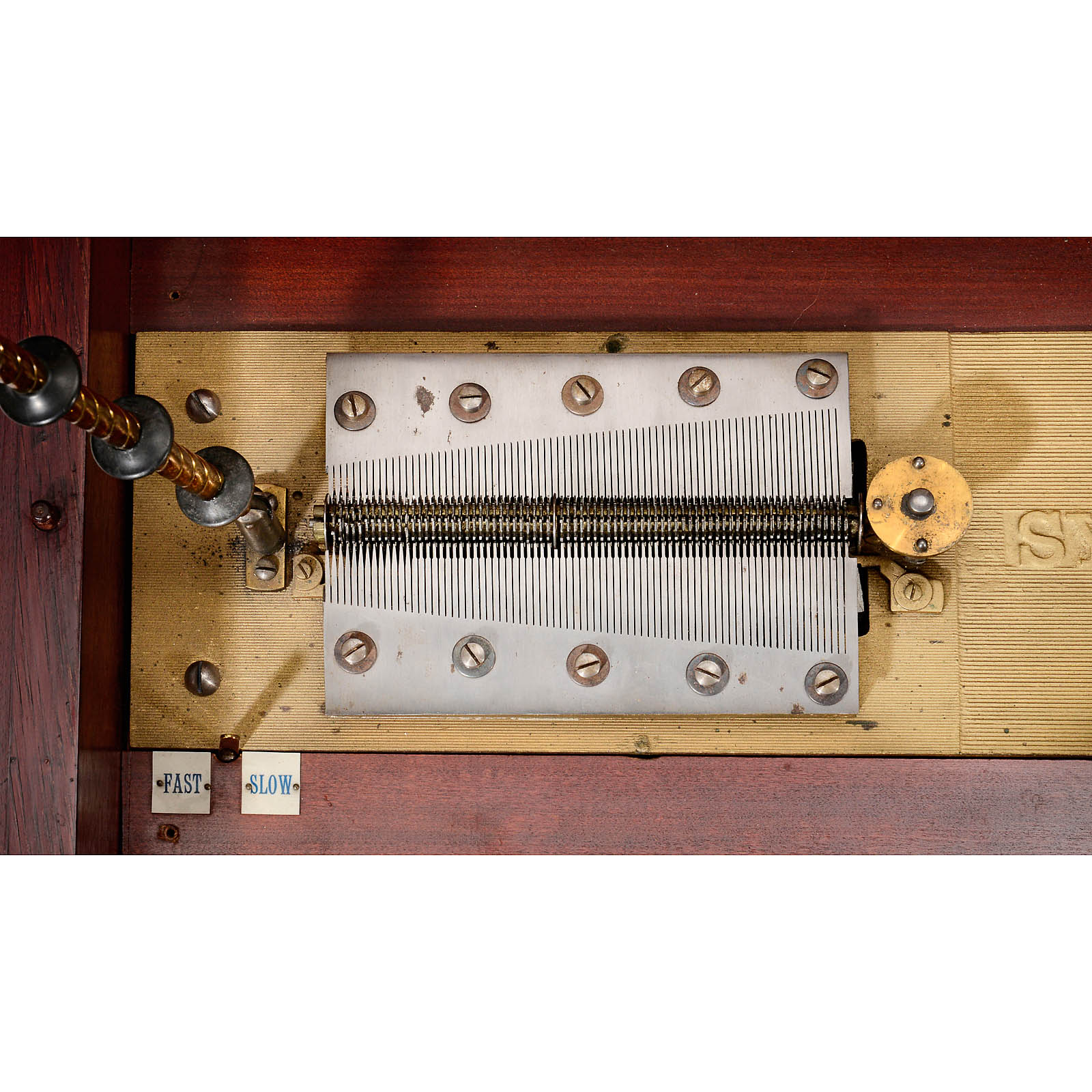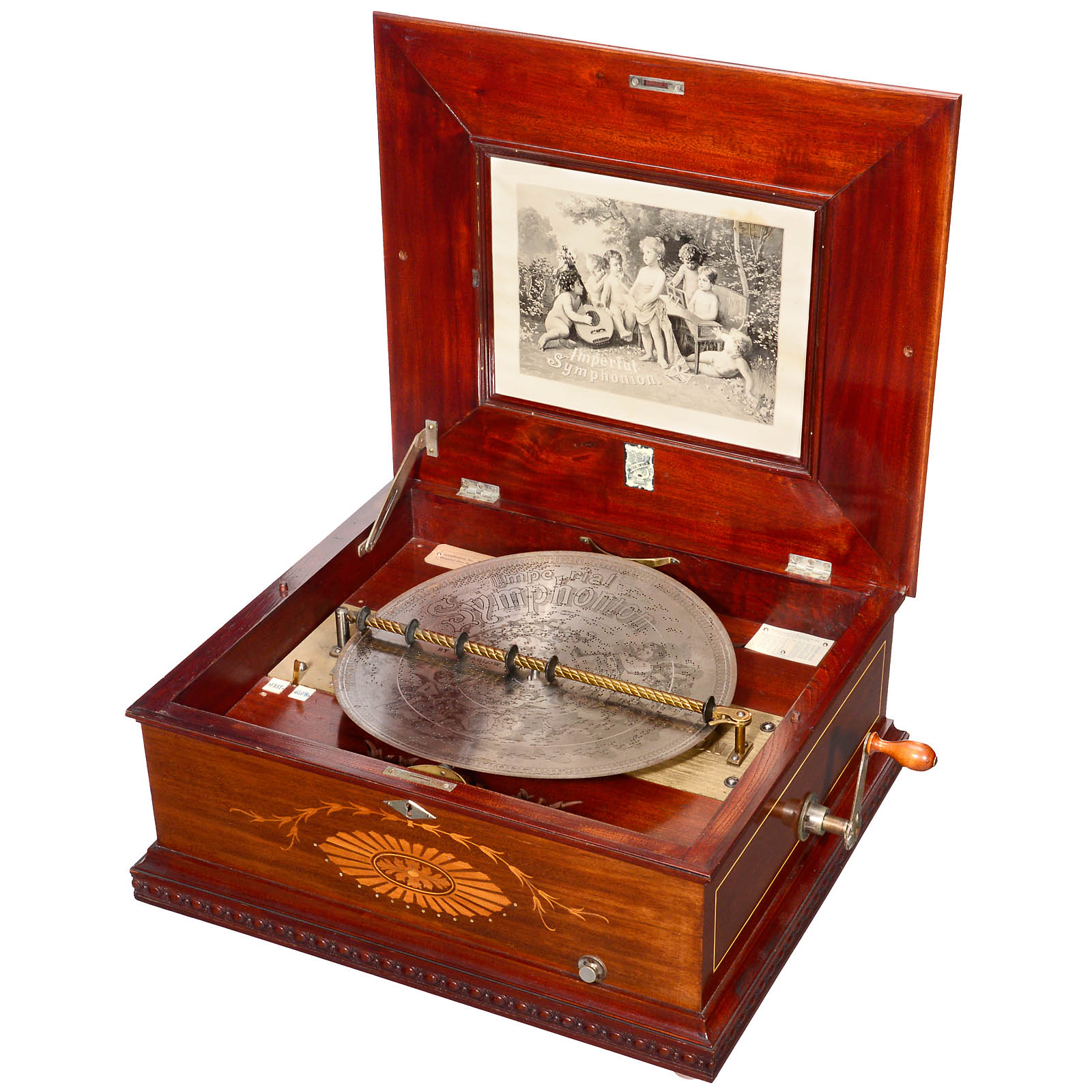 No. 11092. Manufactured by "Symphonion Mfg. Co., New York", for 15 ¾ in. discs, 156 teeth in duplex comb (complete), speed control, mahogany case with border decoration, front with geometric inlays and mother-of-pearl dots, lid with musical motifs, inner lid with original lithograph and "Imperial Symphonion Trade Mark" label. Very good original and excellent playing condition. With 14 discs.