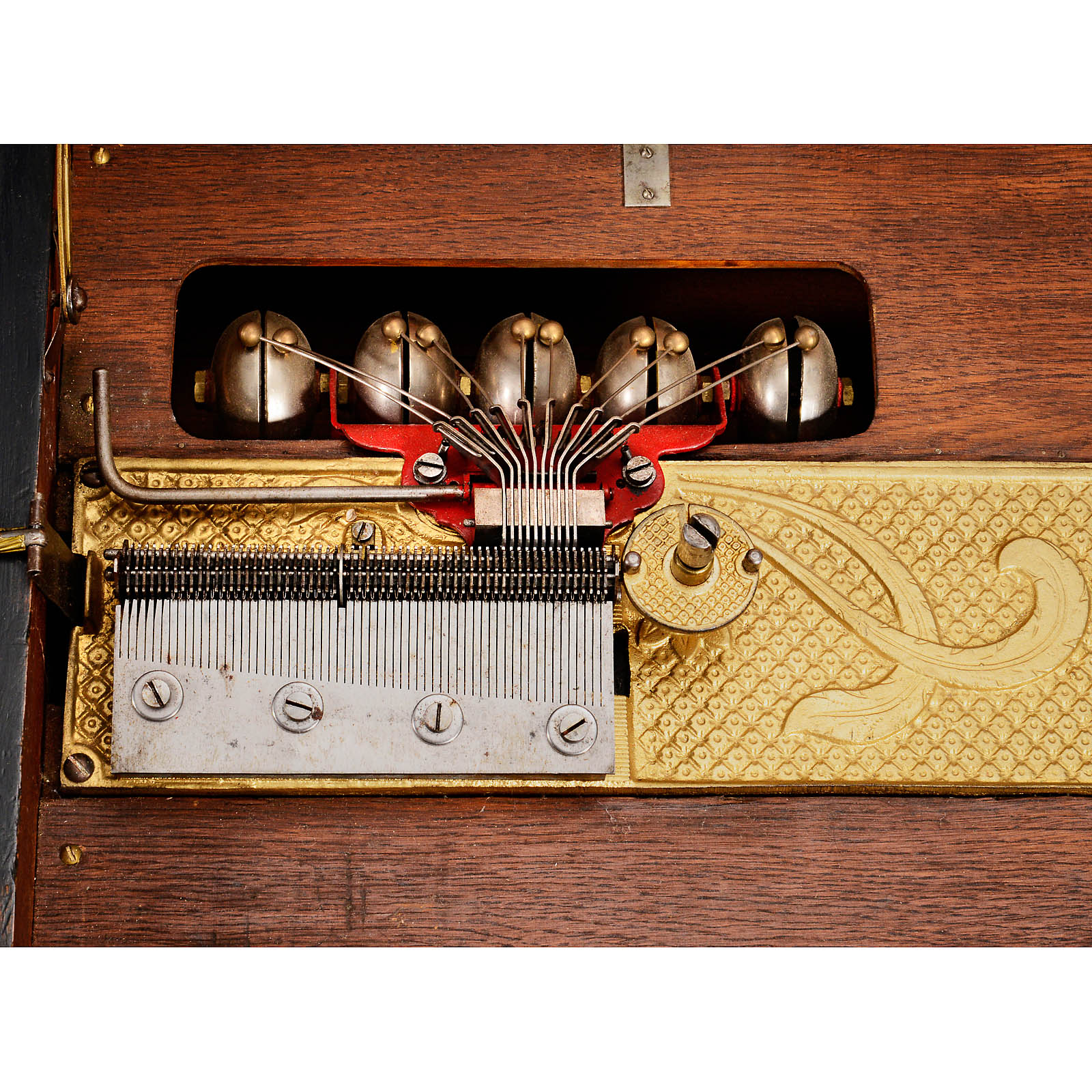 Manufactured by "Kalliope Musikwerke, Leipzig", for 13 1/3 in. discs, 61 teeth in comb (complete), 10 optional bells, lid with original lithograph, case with minor damages. Very good playing condition! With 20 discs.