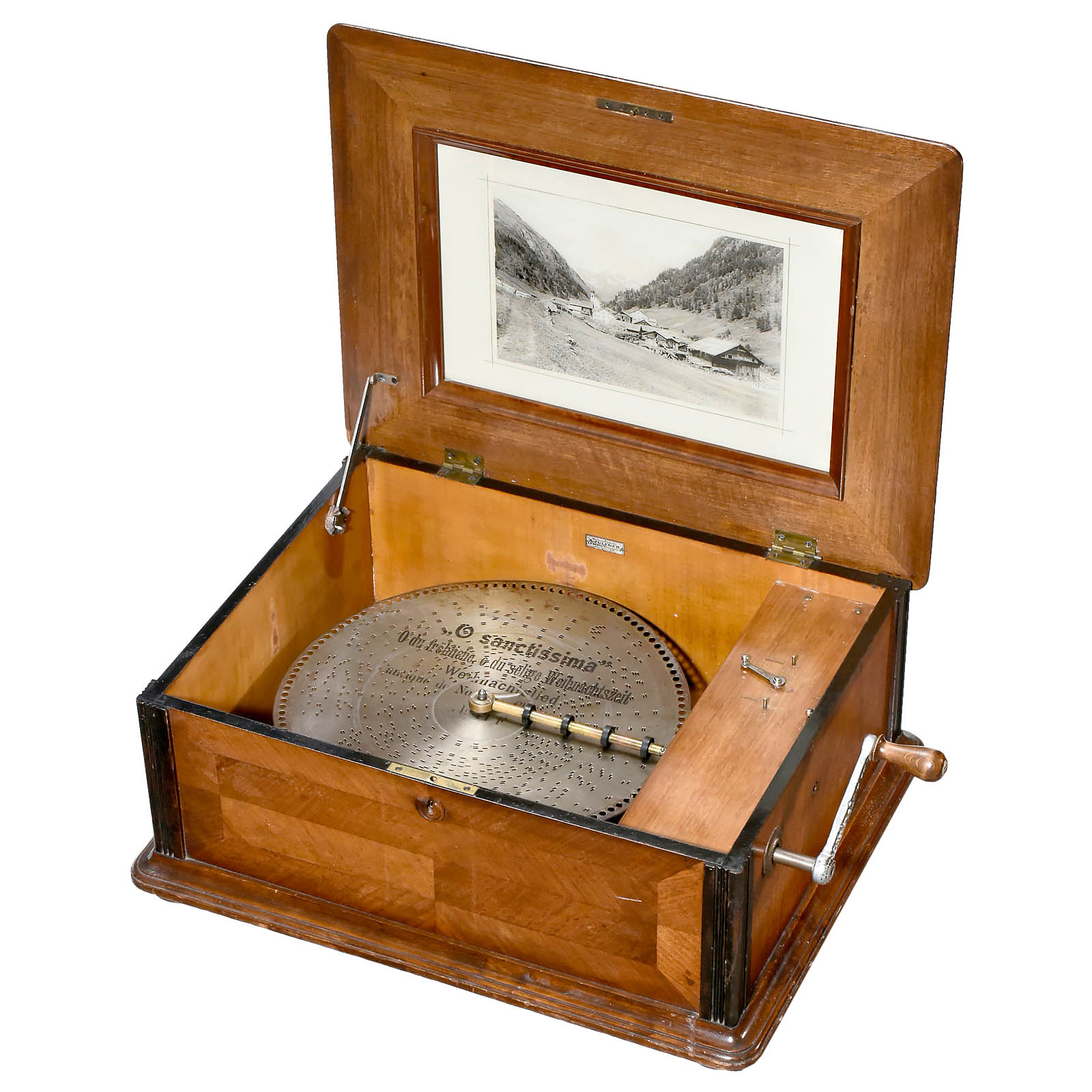 For discs of 15 1/3 in. diameter, no. 244, manufactured by "Original Musikwerke Paul Lochmann, Leipzig", 120 teeth in duplex comb (complete), speed control, walnut case with original lithograph in lid, 24 x 19 x 9 ½ in., with crank. Excellent playing condition! With following 15 discs: Oh Tannenbaum, Wiener Blut, Lustige Brüder, Unsere Garde, Torgauer Marsch, Lose munt're Lieder, Des Jahres letzte Stunde, Nun danket alle Gott, Hochzeitsmarsch, Hab ich nur deine Liebe, Finnländischer Reitermarsch, Oh Sanctissima, Ein Finkennes, Funiculi Funicula, Über den Wellen.