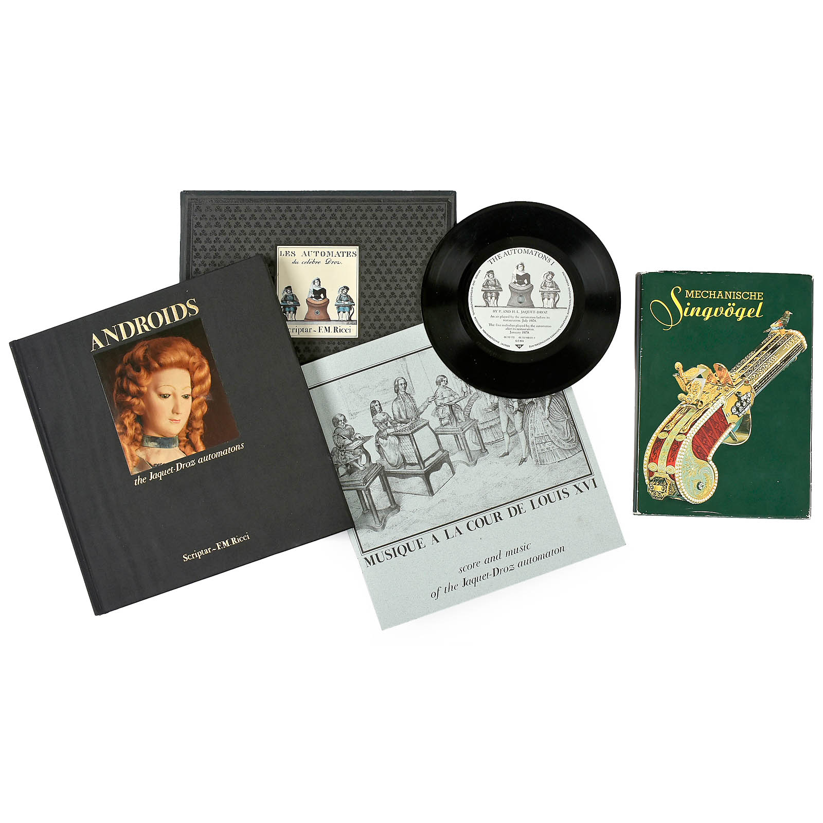 Franco Maria Ricci, Scriptar SA, Lausanne; 94 pages, color illustrations, introduction, history and documentation on the three automata of Pierre Jacquet-Droz; musical score and accompanying 45 r.p.m record (untested) of the Musician automaton playing four airs; all in original presentation box, overall good condition. – In addition: "Mechanische Singvögel" ("Mechanical Singing Birds"), Peter G. Schuhknecht, Hanover, 1977/78, limited edition of 1,000, with inscription by author; 152 pages with illustrations including reprint of c. 1910 Bontems catalog. A valuable work of reference. – Two valuable reference works on mechanical music and automata.