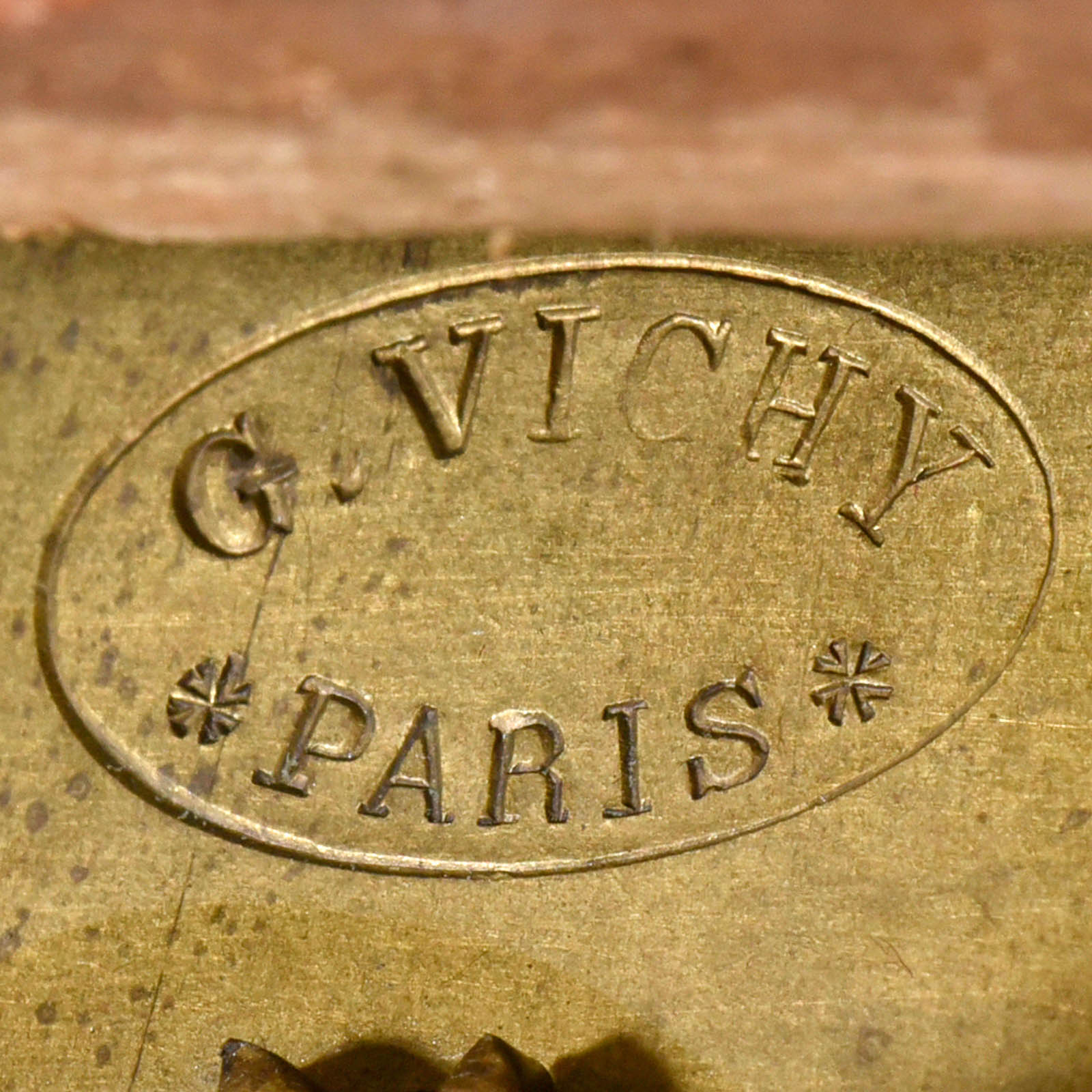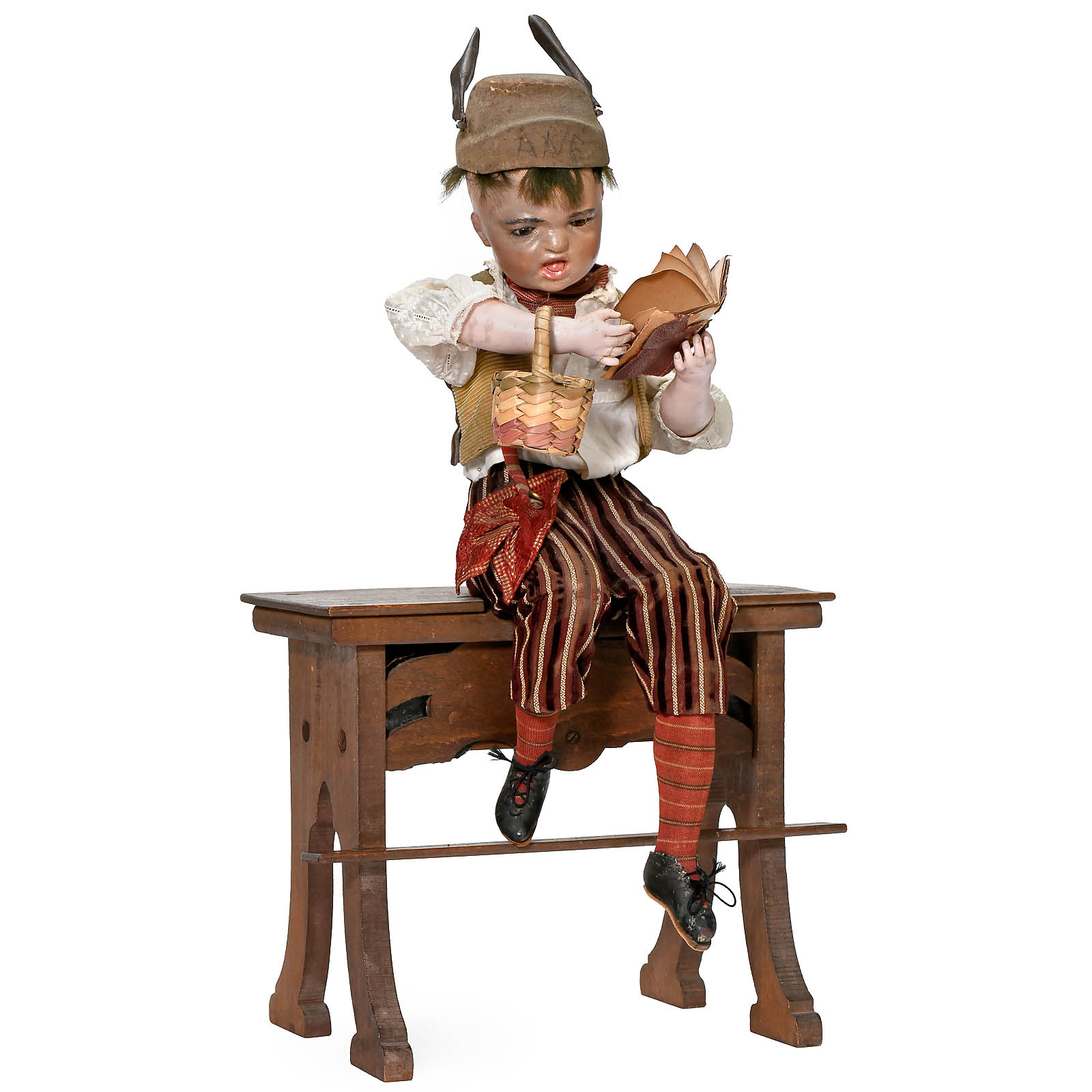 Modeled as a crying boy atop a school bench, with plaster-composition character head, original paint, narrowed brown glass eyes, open-closed mouth with painted teeth and tongue, brown mohair wig, papier-mâché dunce's cap with articulated metal donkey ears, bisque hands, four-cam going-barrel movement stamped "G. Vichy, Paris" and accompanying two-air cylinder movement, dressed in original red-and-white wool vest, satin waistcoat, shirt, striped velvet breeches, handkerchief, stockings and leather shoes, ht. 19 in., with acorn stop/start, five fingers repaired, tip of right little finger missing. – Literature: Bailly "Automata, the Golden Age", pp. 104 and 244. – The title of Vichy's automaton was probably a reference to Jacques Offenbach's 1864 operetta "Jeanne Qui Pleure & Jean Qui Rit" ("Joan who Cries and John who Laughs). The 'sister' piece to this automaton, titled "Jeanne qui Rit", depicts a smiling girl on a school bench. – The expressive features of both figures are characteristic of the automata produced under Gustave and (his son) Henry Vichy's creative collaboration during the 1890s. Similar faces are also found modeled in wax as a pair of school boys and in bisque as the laughing/crying "surprise" doll by Leon Casimir Bru. – Jean nods and shakes his head in a circular motion as he peers at the book, raises his right arm to his eyes as though crying and kicks his left leg impatiently. Vichy adds a characteristic element of humor to the scene as the boy's donkey-like ears, appearing to take on a life of their own, flap up and down. A classic Vichy automaton in good, original working condition.