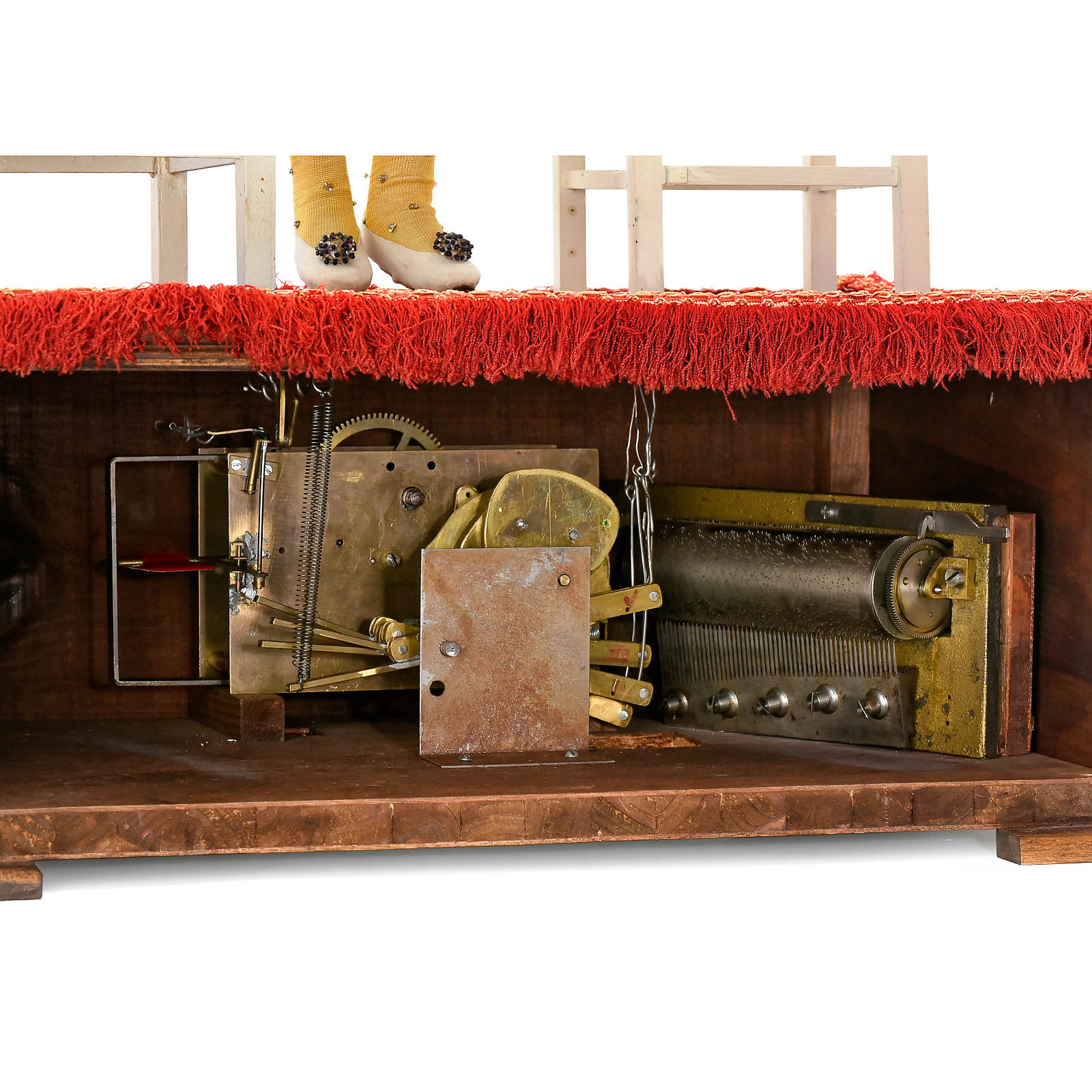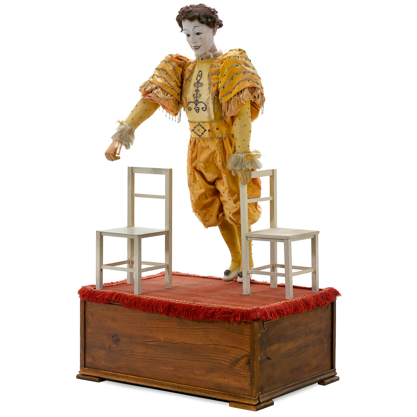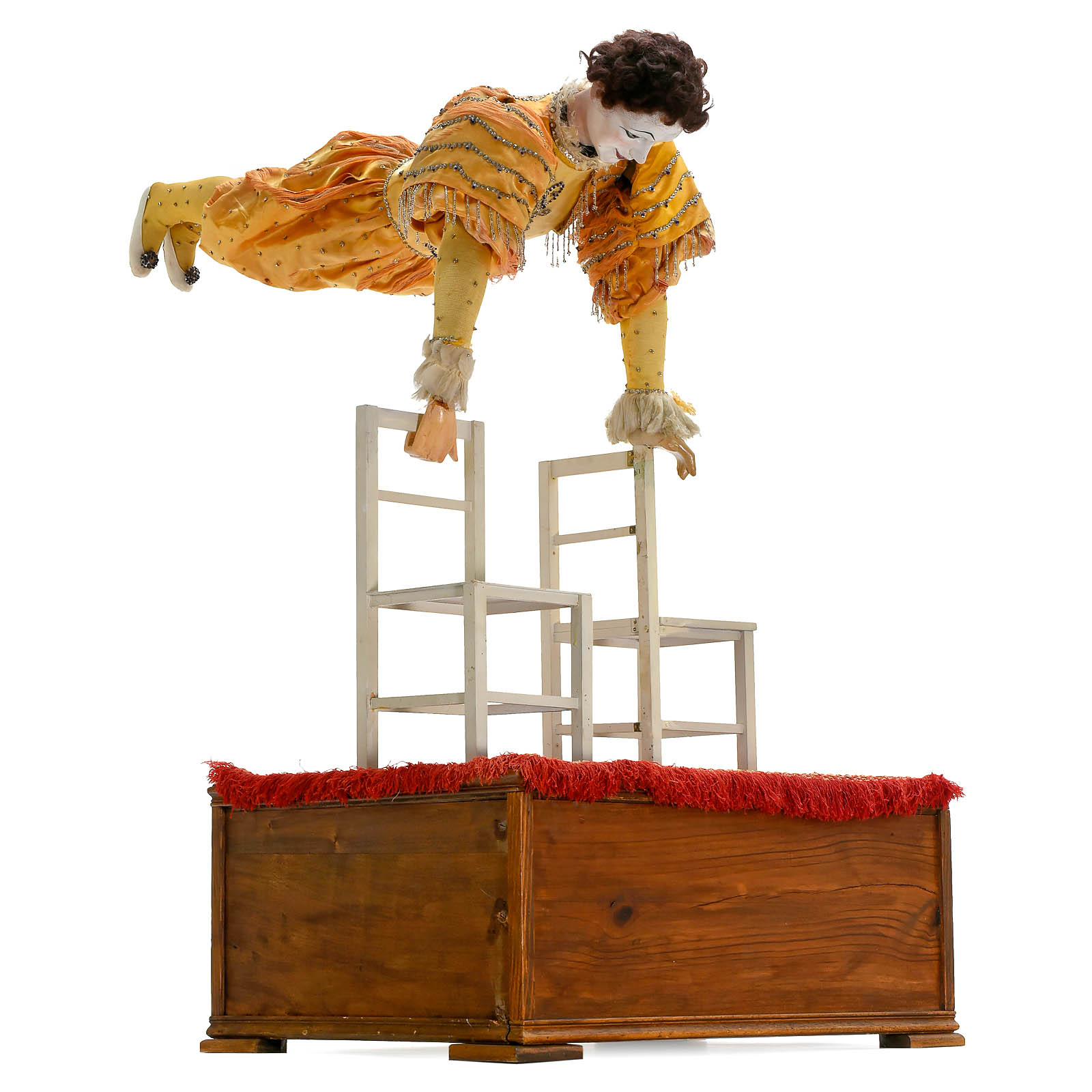 With plaster-composition head, fixed brown glass eyes, open smiling mouth with two rows of modeled teeth, curly mohair wig, shapely papier-mâché body, two painted wood chairs and wood base containing large going-barrel motor driving five cams and four-air cartel cylinder movement, dressed in elaborate gold silk circus costume trimmed with glass beads and sequins, ht. standing 35 in. (89 cm), base 13 ¼ x 19 ½ x 8 ¼ in. ht. (34 x 50 x 21 cm), face repainted. The automaton was substantially restored during the early 1990s. Rebuilt/replacement elements include the motor, musical movement, parts of the base and the figure's right hand. – The performance begins with the gymnast standing between the two chairs. He raises the chair in his right hand and flexes his wrist, then lowers the chair and elevates his body into a handstand position. In mid-air he raises the chair a second time, flexes his wrist, lowers his head and then lowers his body slowly back to a standing position. The gymnast looks up as if for applause and, as the conclusion to his performance, raises his right arm again – this time without the chair! – Provenance: Sotheby's, London, 10th November 1995, lot 220. Christie's South Kensington, 3 May 2006, lot 201. – Literature: Mary Hillier, "Automata & Mechanical Toys", p. 100 for similar piece. – A celebrated Vichy design of great ingenuity, the trick of lifting and lowering a free-standing object was an accomplished feat for an automaton of the early 20th century. The head – a rare model – is usually found on the Vichy "Clown Serpent" automaton, illustrated on p. 94 of "Automata, the Golden Age" by Christian Bailly. An impressive performer with great 'stage presence'!