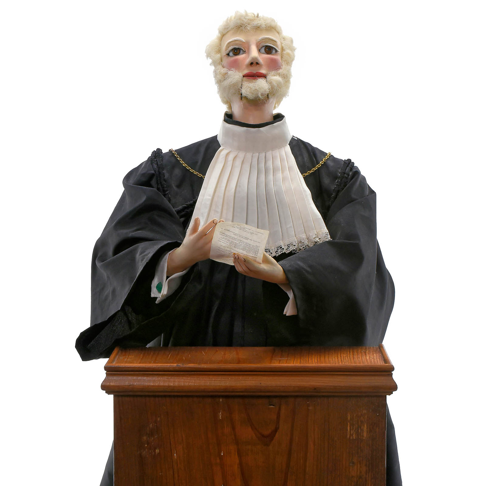 With papier-mâché head, brown glass eyes with articulated lids, hinged jaw with inset teeth and tongue, white mohair wig, whiskers and beard, standing behind a pine rostrum, with three-air cylinder musical movement and seven-cam going-barrel automaton movement, dressed in black silk ermine-trimmed robes, ht. 29 in. (74 cm), paint restored, rostrum possibly an old replacement. – A large and very animated piece, the Advocate was advertised in the catalog of Gustav Uhlig of Halle, Saxony, as "near-natural" and "suitable for any business that wishes to use it for advertising purposes". – The figure looks around, blinks and raises a document which he inclines his head to read. His left hand sweeps up and down and then in a circular motion as he beats the document and moves his mouth as though delivering a lively speech. – Rare 'occupational' automaton, in excellent working order. – Literature: Similar pieces illustrated in: Chapuis & Droz, "Automata, An Historical and Technical Study", p. 337; Bailly, "Automata, the Golden Age", p. 167; Uhlig catalog reproduced in Bowers, "Encyclopedia of Automatic Musical Instruments", p. 78.