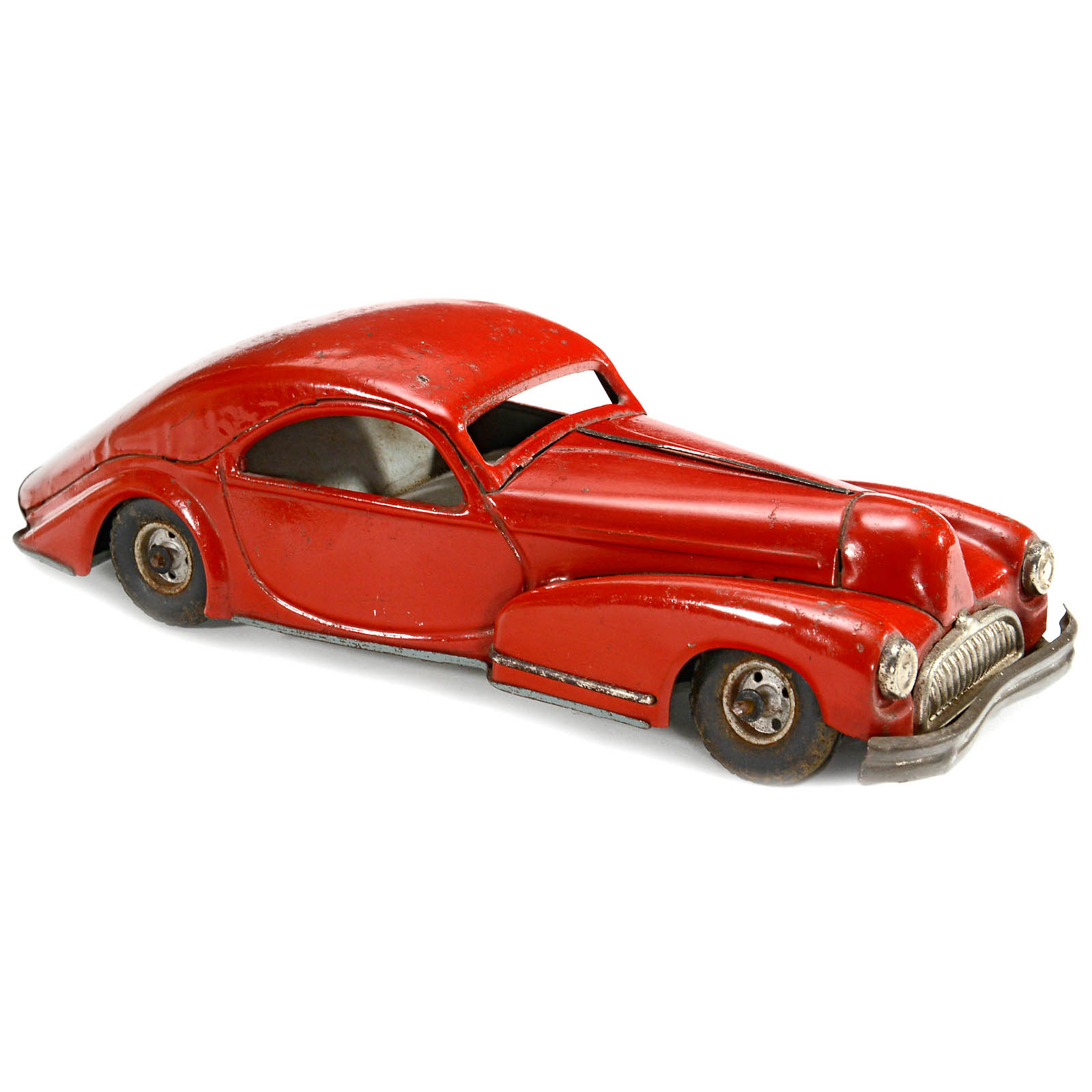 Siegfried Günthermann, Nuremberg, red japanned tin, clockwork (working), length 10 1/5 in.