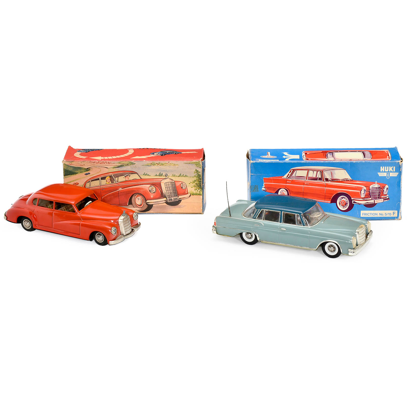 1 "JNF", Josef Neuhierl, Fürth. Adenauer Mercedes M 300, clockwork intact, length 9 ½ in. – And: 2) "Huki", Hubert Kienberger, Nuremberg. Mercedes 220 E, friction intact, length 9 7/8 in. – Tin, lithographed interiors, original boxes.