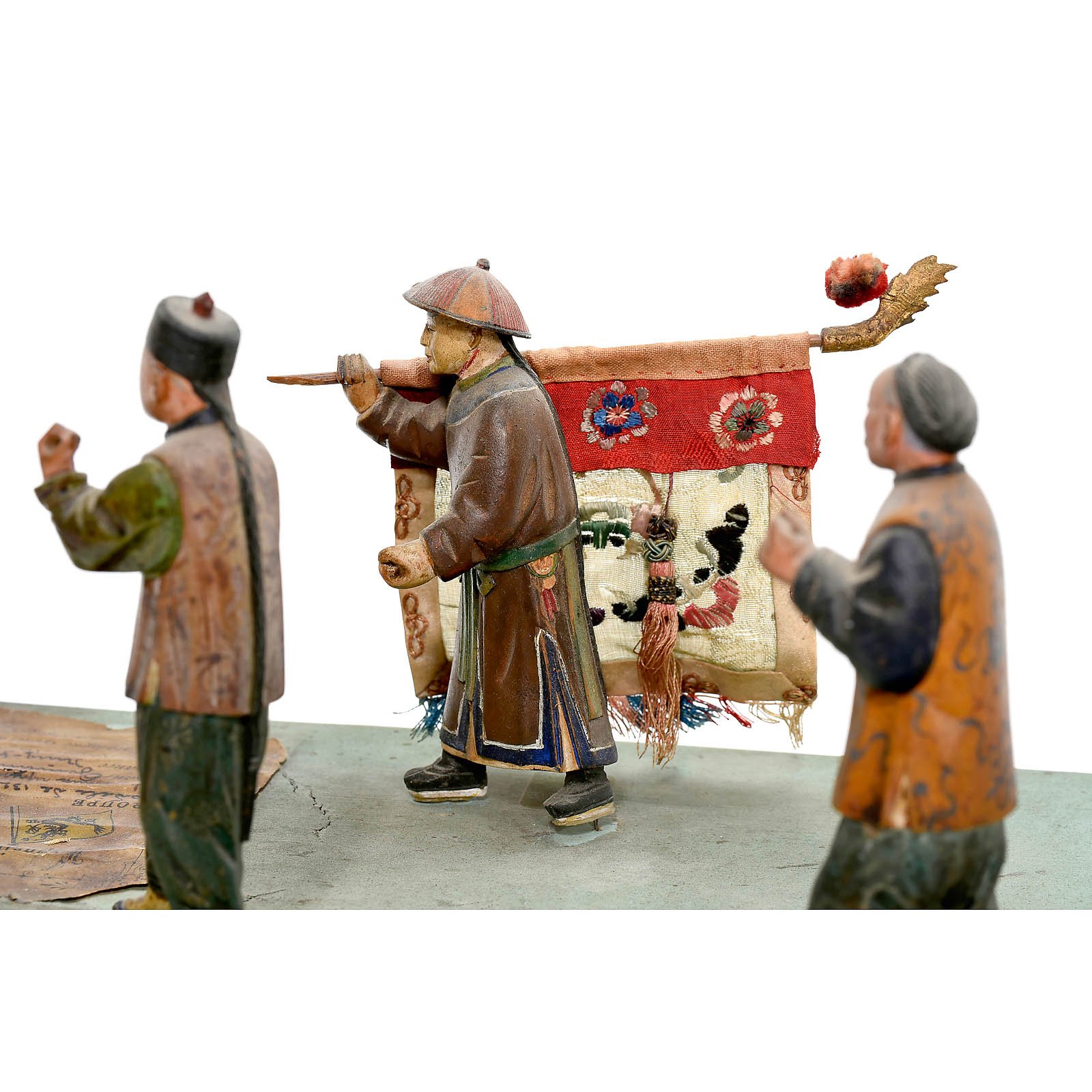 Depicting a procession of thirteen finely-carved and painted wood figures in Qing Dynasty costumes, including dragon-standard-bearers, two men carrying miniature temples, a masked man and flag-bearers, one with embroidered flag of the Eastern Han Dynasty general Guan Yu, on wood base with label: "Exposition Universelle de Paris, 1900. Groupe XII, Classe 71, Modele de 132 Figures …. Representant la Procession Annuelle de la Fête de Printemps, Exposant: Gouvernemente Chinois, Provenance: Ning-Po, No. 196", figures approx. 4 in. (10 cm) high, base 6 ¾ x 33 in. (17 x 84 cm), good overall condition, musicians missing instruments. The Exposition Universelle de Paris ran from 15 April till 12 November 1900 and attracted almost 50 million visitors. The figures were presumably the vanguard of a larger procession, made up of similar groups, exhibited by the Chinese government.