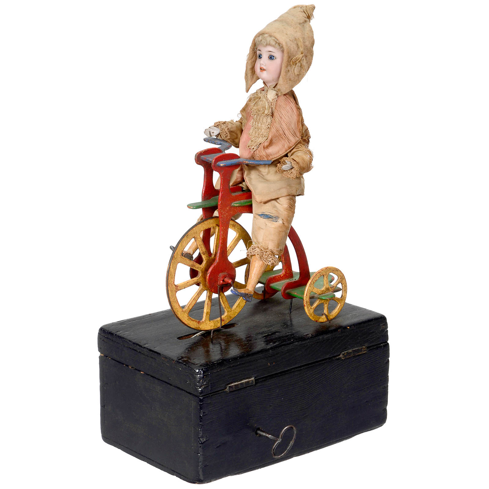 With bisque head impressed "4600 6, SPBH" for Schoenau und Hoffmeister, open mouth, fixed blue glass eyes, curly blonde mohair wig, articulated legs, carved wood hands and feet, seated on polychrome-painted high-wheel wood tricycle, on box base containing bench-built going-barrel motor causing the front wheel to roll as cyclist pedals, dressed in original satin costume, lace jabot and felt hat, height 21 in. (53 cm). An early cycling toy in good working order.