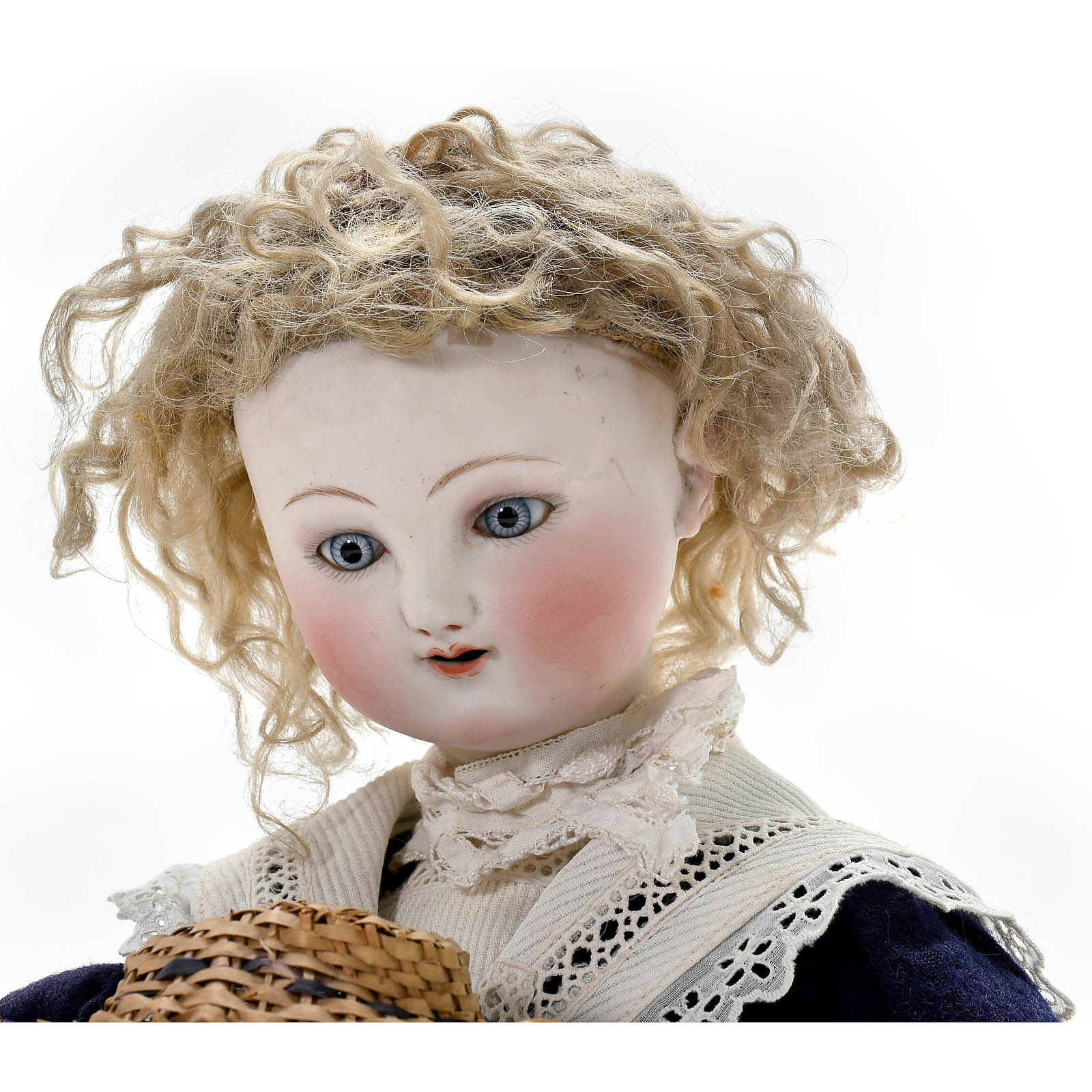 With pressed bisque socket head impressed "2", open mouth with upper teeth, fixed threaded blue glass eyes, shaded lids, light grey lashes, feathered brows, un-pierced ears, hand-tied blonde mohair wig and later five-piece papier-mâché body with musical open-spring mechanism in torso that causes the figure to raise her head and lift a basket lid to reveal a pair of all-bisque babies, dressed in blue wool costume, ht. seated 15 in. (38 cm), with monogrammed "RD" (Roullet et Decamps) key, head movement slight, wig not removed.
