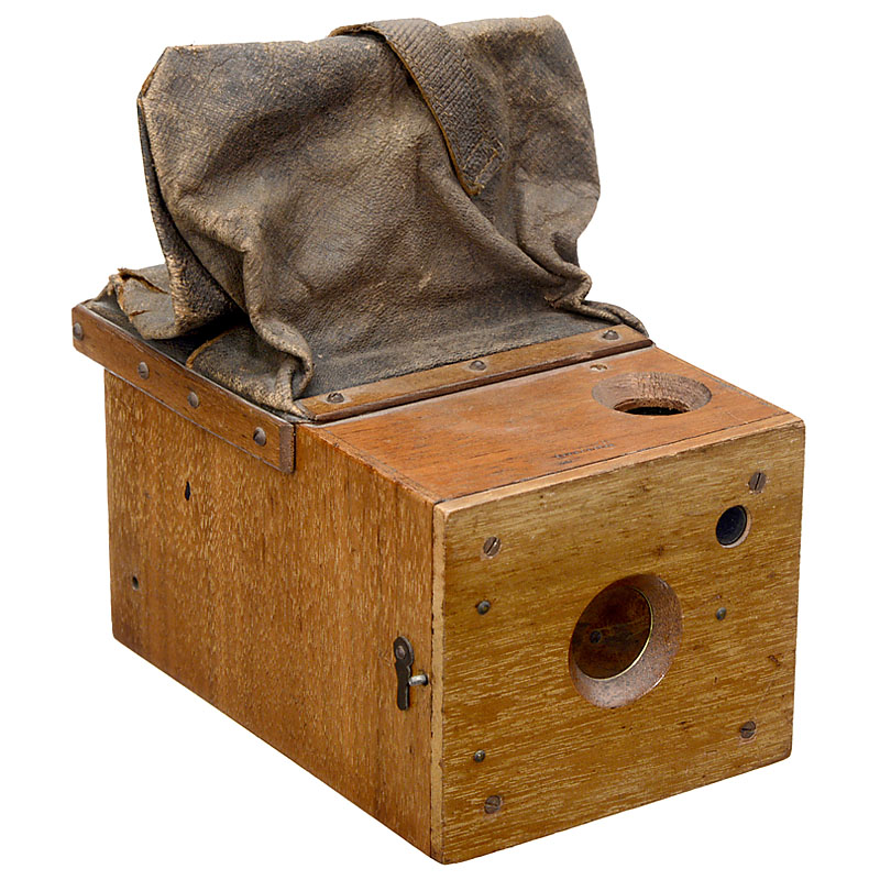 Stirn, Berlin. Polished wood detective camera for 12 plates. The rare small version for 6 x 8 cm plates, early version with guillotine shutter and one finder, 10 cassettes inside. Camera working, only the 2 operating knobs missing. – Nice and rare small camera!