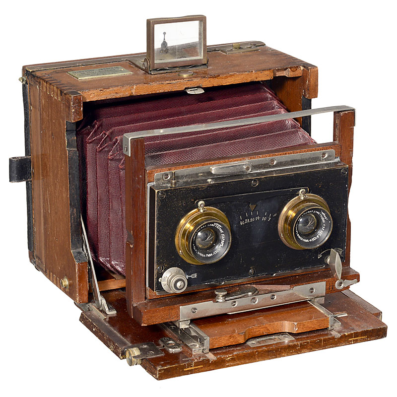 Comptoir Française de Photographie, Passage des Petites-Ecuries, 8, Paris. Tropical wood, two 6 x 9 cm on 9x12 plate, dark-red leather bellows, 2 x Anastigmat Symétrique "Verax" F:7 F.90 mm", by H. Duplouich Paris, 7 shutter speeds, focusing screen back a