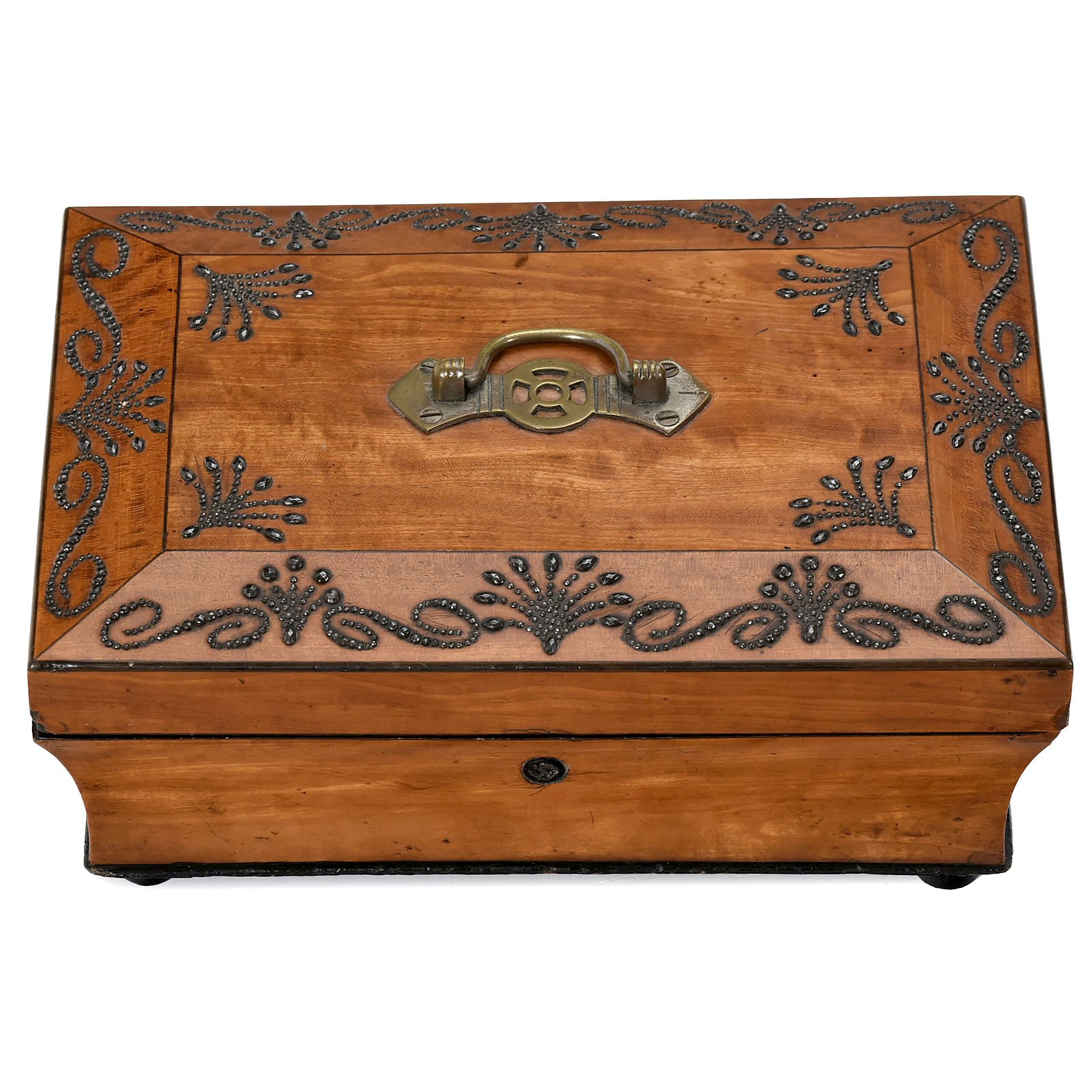 With two-air sectional-comb inscribed "A & B N. 1620", 18 groups of 3 teeth (complete), fitted tray containing: silver thimble, mother-of-pearl needle case, bodkin und bobbin, pincers, scissors and cut-glass scent bottle with stopper, in satinwood-veneered sarcophagus-form case with jet-decorated lid, width 8 ¼ in. (21 cm).