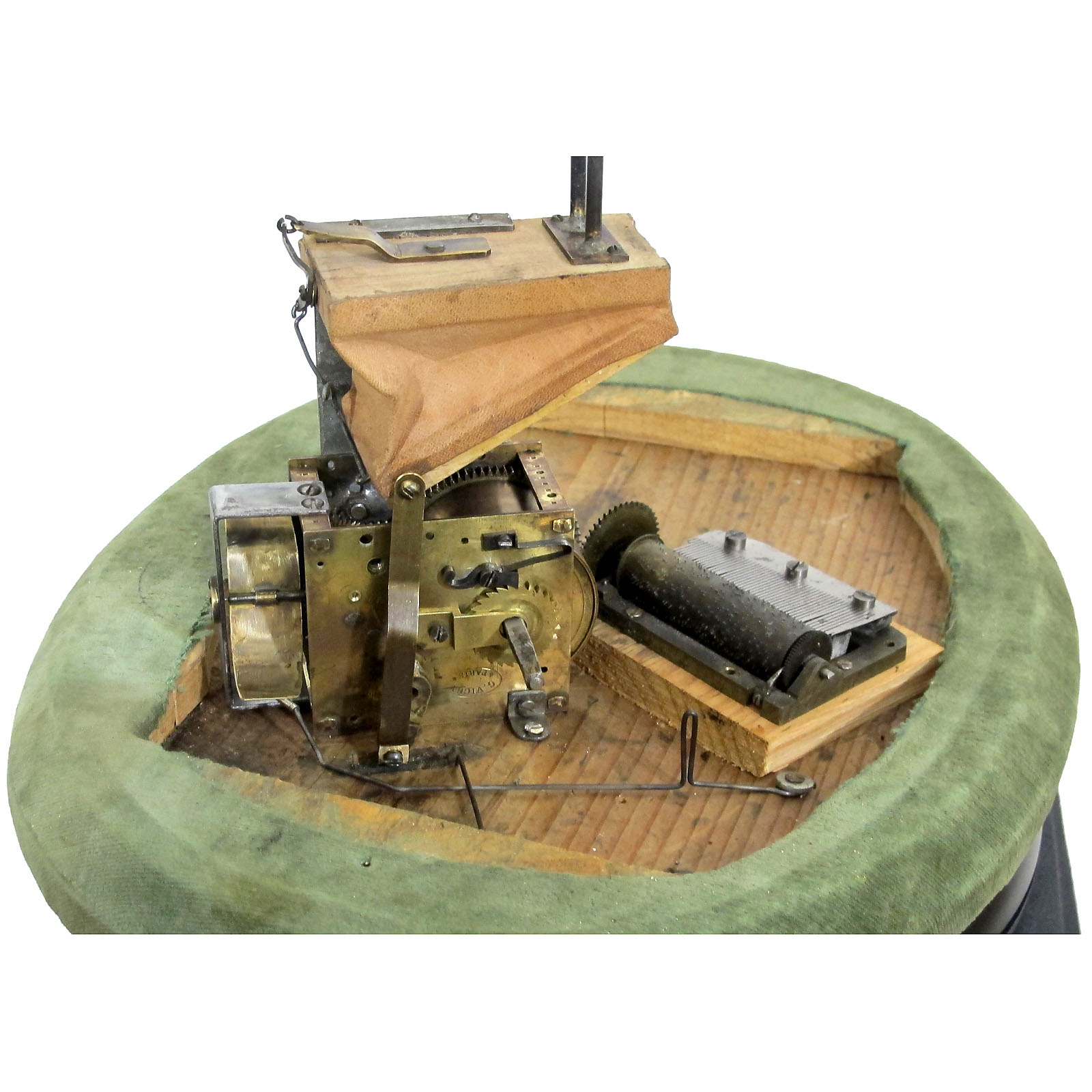 Depicting a young man with large full moon face leaning against a fluted column, a cigarette between his lips and a walking cane in his right hand, with plaster-composition head, articulated brown glass eyes and wire monocle, dressed in burgundy satin tailcoat, cream silk waistcoat, yellow tie and pointed shoes. The base containing going-barrel motor stamped "G. Vichy * Paris *", three cams, bellows and two-air cylinder movement, ht. 29 ½ in. (75 cm), old paint surface on face, original paint on pillar and hands, with steel key and acorn-form stop/start. The figure tilts his head from side to side, rolls his eyes and twirls his cane as he inhales from a lighted cigarette placed in the holder and blows the smoke out through his nose. The movement is in good restored working condition. The "Lune Fin de Siècle" – one of Vichy's most recognisable automata – draws on the popularity of the moon as a motif in French literature and visual culture during the late 19th and early 20th century. Perhaps the most famous motif of the moon as a human face is found in Georges Méliès's silent film "Voyage dans la Lune" (1902). "Lune Fin de Siècle" was described by Léo Claretie in his account of the French toy industry "Les Jouets, Histoire-Fabrication", written in around 1894, as "a young man whose head is a full moon, bright and shining, balancing in clouds of smoke". The German retailer Gustave Uhlig of Halle advertised the automaton in his catalogue of the same period as a "Mode Geck" or dandy, the "image of a man in love". Gustave Vichy and his son Henry both used the face of the "Lune Fin de Siècle" as a registered trademark on the company's letterheads, labels and advertising. The original model may have been sculpted by Henry Vichy himself. Certainly the figure shows signs of Henry's influence, including the shapely modeling of the slender body and a sense of the unexpected in the large round head that appears to rest upon it. Another indication of Henry work is the pencil date "9.12.91" found on the figure's bedplate. During this time father and son were working together under the name G & Hy. Vichy. The practice of the Vichy firm to date its automata is seen in the similarly marked Lot 629 (also by Henry Vichy) in this catalogue. Despite the importance of the automaton as the firm's trademark, very few examples of the "Lune Fin de Siècle" appear to have been produced or to have survived. To date we know of eight other examples – five in private collections, three in museums: Museé de Louvain-la-Neuve, Museé de Neuilly and Kyoto Arashiyama Organ Museum. Provenance: "Lune Fin de Siècle" was part of the Atracciones Apolo, an indoor amusement park opened by Josep Vallés Rovira on Parallel Avenue, Barcelona, in 1935. Atracciones Apolo was a popular destination and featured in two films: "Apartado des Correos 2001" (1950) and "El fugitivo de Amberes" (1955). Alongside the magic grotto, the "Autogruta" ghost train and other rides, the park also contained the "Museo las Maravillosas Figuras en sus Dioramas" (Museum of Marvellous Figures in their Dioramas) featuring automata exhibited as scenes in floor-standing cabinets. The automata in the Apolo had presumably once formed part of an older Spanish collection, as the majority of the figures originated in the workshops of Gustave Vichy, Leopold Lambert and Roullet et Decamps. All operated from electric motors but many (including the "Lune Fin de Siècle") also retained their original clockwork motors inside the cabinets. According to an article published by "Edición del Domingo" on 19 August 1990, the automata exhibit closed in 1957. During the following two decades many of the other original features also disappeared as Atracciones Apolo transformed into an amusement arcade. The park closed its doors to the public in around 1991 and the bulk of the building was demolished. The Apolo's collection of automata and mechanical effects was eventually dispersed amongst La Fira bar in Barcelona, the Museu de Joguets i Autòmats in Verdú and a well-known antique doll specialist in the South of England. The automaton offered here has been restored to full mechanical function at the House of Automata in Forres, Scotland. Restoration included re-fitting the governor and replacing the bellows unit and lower part of the plinth base to the original pattern. – A rare and surreal automaton with a significant provenance. References: Léo Claretie, "Les Jouets, Histoire-Fabrication", published in "The Musical Box Society International", Winter 1976, p. 29; "A Great and Magical Collection", catalogue of Museu de Joguets i Autòmats, pp. 313–325; "Edición del Domingo", 19 August 1990, p. 18. http://archivo.elperiodico.com/ed/19900819/pag_018.html; Bailly, "Automata, the Golden Age", p. 68, for similar piece.