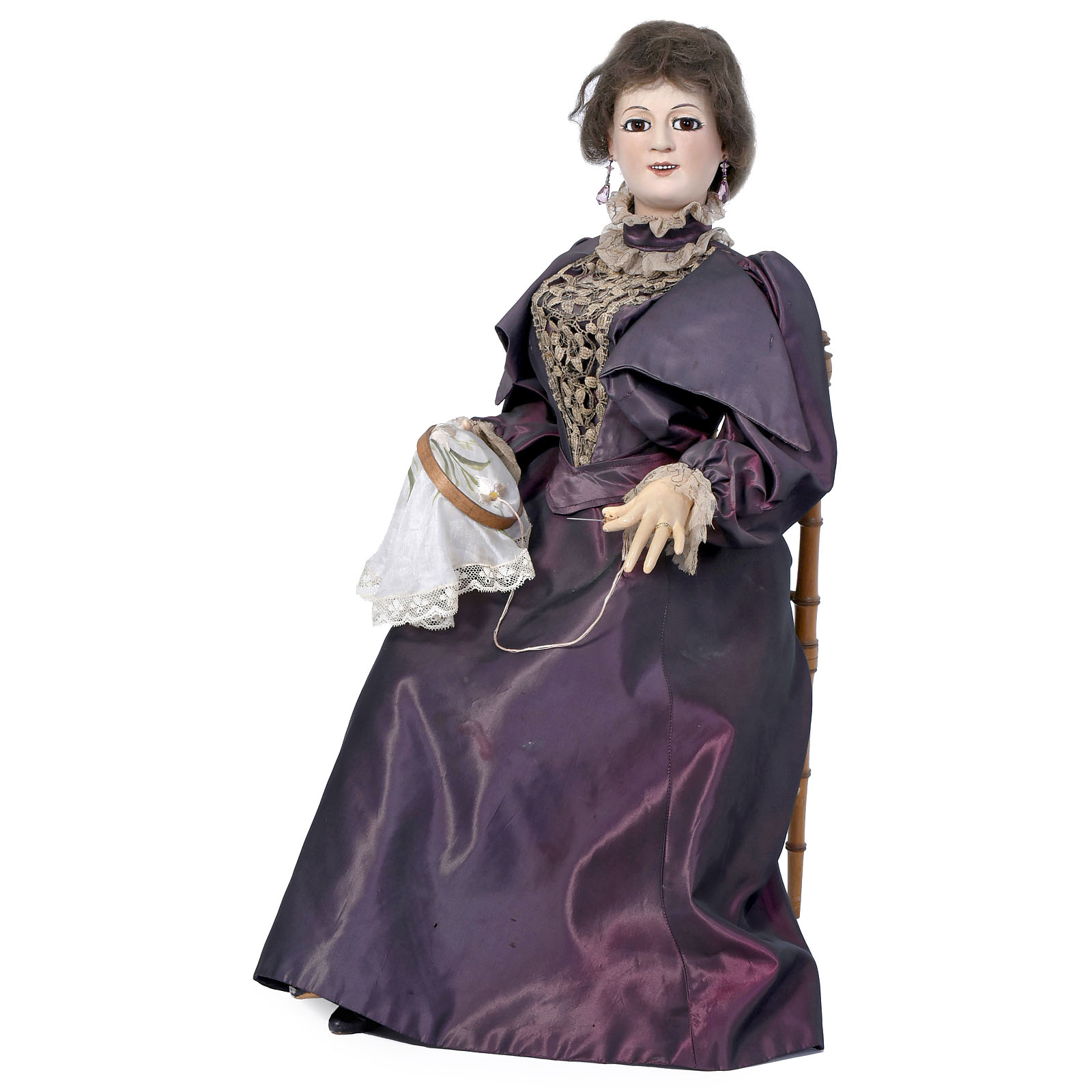With plaster-composition head, brown paperweight eyes with articulated lids, dressed hair wig, shapely papier-mâché body with slender waist, crossed legs and articulated breast-plate, an embroidery frame in her right hand and needle and silk in her left, going-barrel movement playing two airs and causing the figure to turn and then incline her head, raise the embroidery and move the needle realistically while her eyelids flutter and her breasts rise and fall to simulate breathing, in silk costume with lace bodice, choker and wing-collar, height 24 in. (61 cm), seated on period chair with turned back and rush seat, with pierced Vichy key and 'acorn' stop/start, paint restored, a few dampers in need of adjustment. – One of a series of Vichy automata depicting Parisian ladies of the belle epoque at work and play, the same facial mould was employed for various figures and the movement concealed in the torso, which is articulated to give the illusion of gentle breathing. A very elegant Vichy automaton in good working condition.