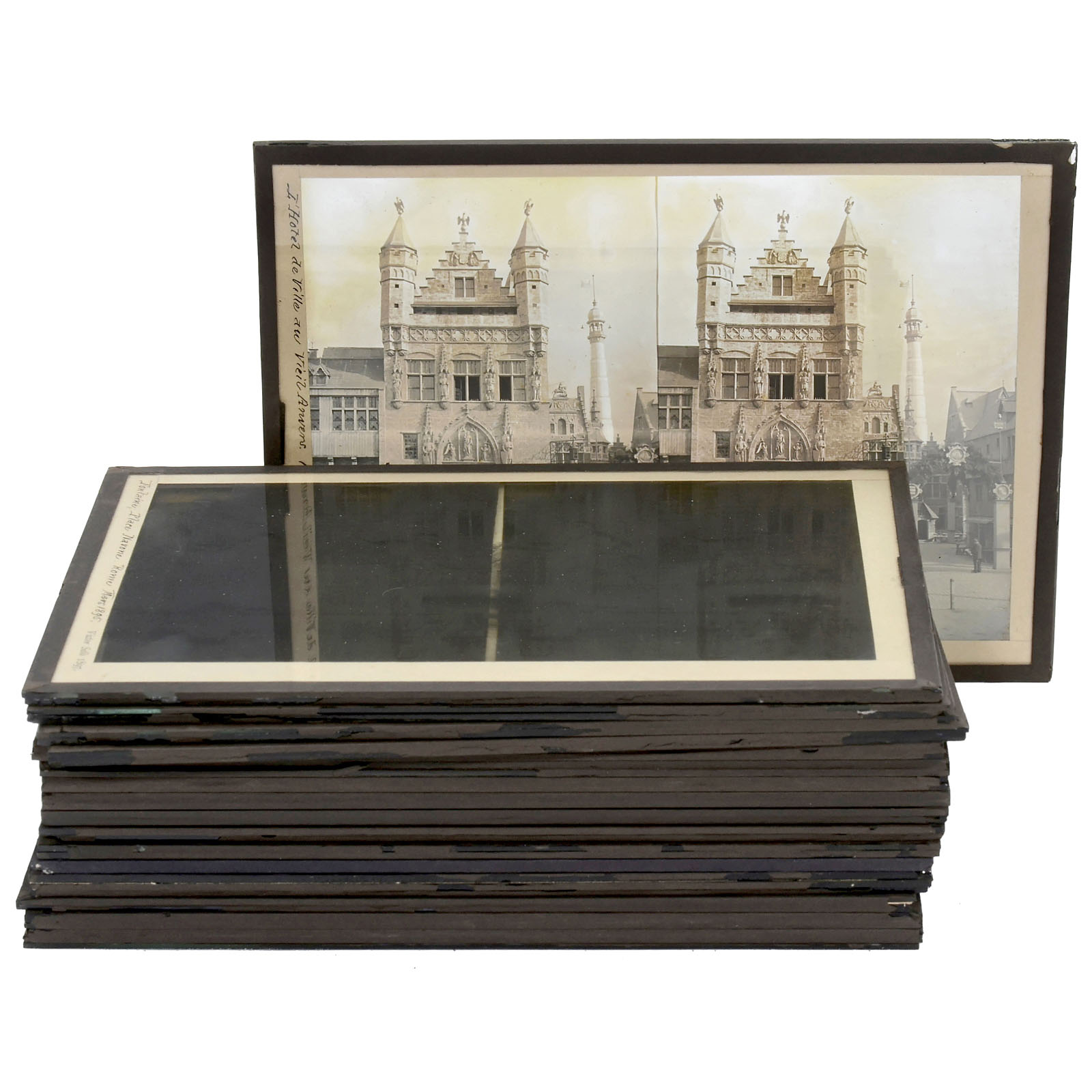 18 double-glass stereo slides of 13 x 18 cm, by the Belgian photographer Victor Selb, including 10 pictures of old Antwerp (Vieil Anvers) and 8 pictures of Italy (mostly classical buildings), rare format for stereo slides.