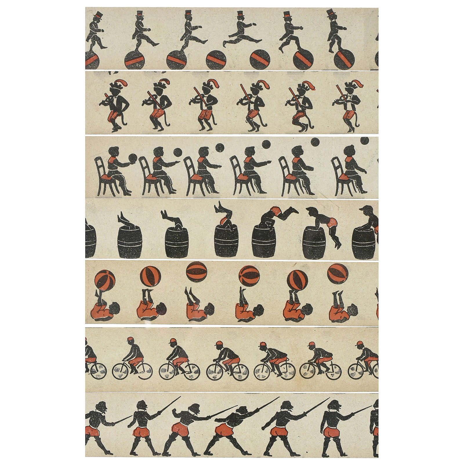 The tiniest tin toy "wheel-of-life" offered yet at auction! Tin drum and brass stand. With 7 twin-sided comic paper strips (approx. 1,18 x 7,08 in.), height 3 in. x 2,2 in. diameter. – Extraordinary rare collector's item!