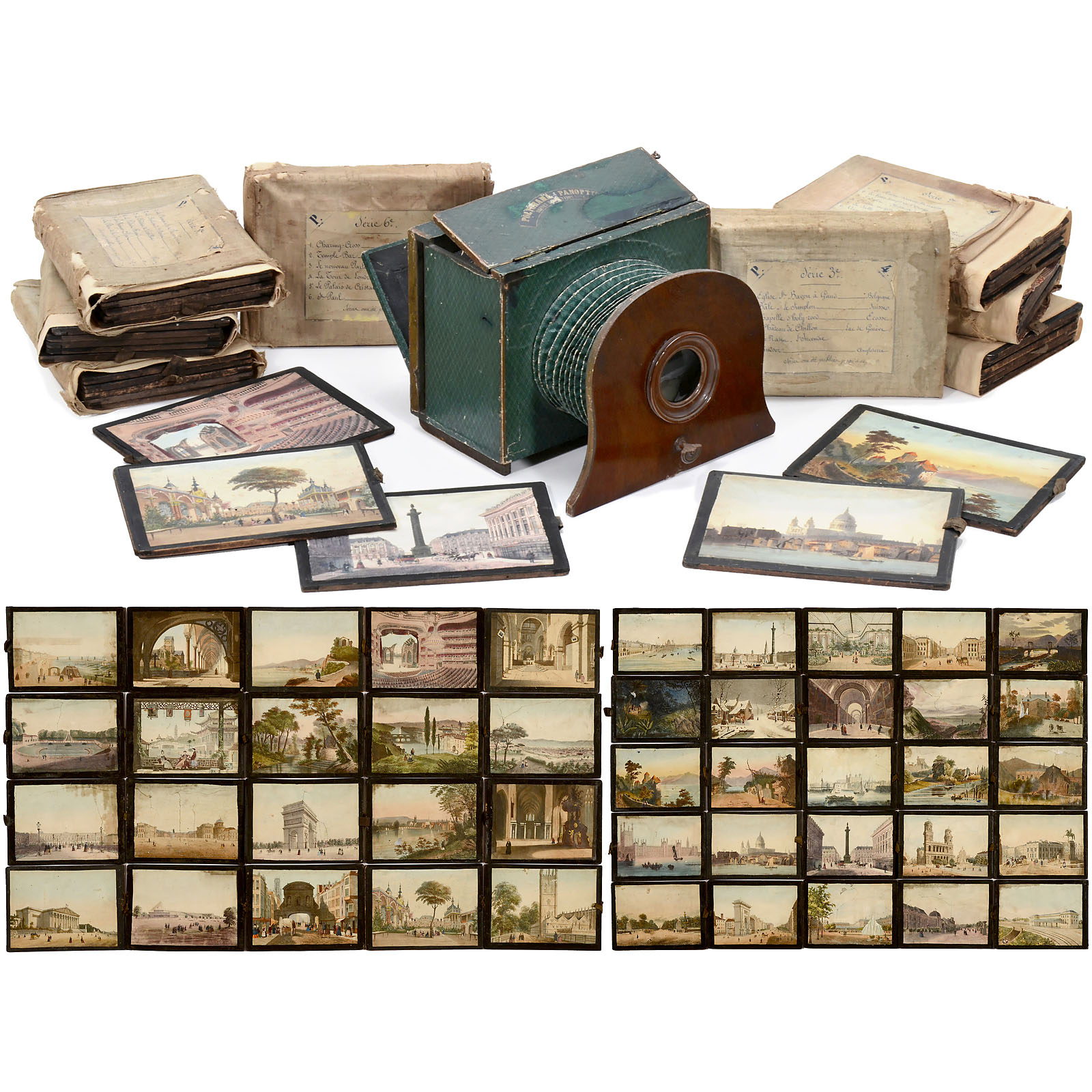 French viewer, size 7 x 8 in., for day and night pictures 5,5 x 7,9 in., mirror missing. With 45 (!) tinted paper pictures in wooden frame (some have to be restored, but predominantly in good condition). – All plates in 8 original burlap bags, 6 bags with original inscriptions (series 2–6 and 8).