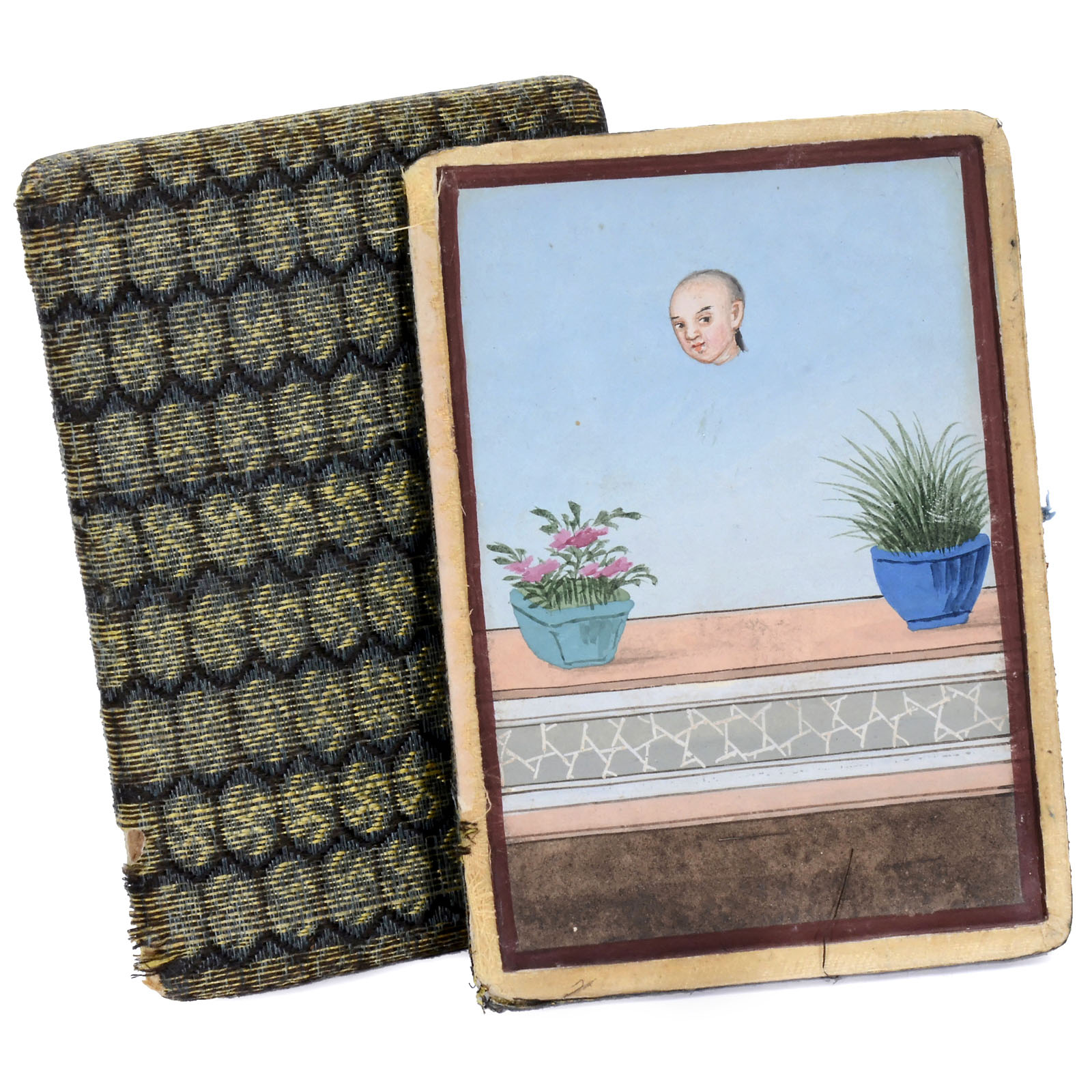 Comprising a pair of male and female watercolor portraits and twelve finely hand-painted mica overlays, six for each sex, with variations in costume, occupation (including archer and warrior) and hairstyle, in silk-covered cases originally joined together by a ribbon, overlays approx. 2 5/8 x 3 7/8 in. (6,7 x 10 cm). Good overall condition, case missing ribbon, bright colors. Note: "Changements Inattendus", metamorphic or protean transformation sets are examples of early optical toys which demanded an act of interpretation, a way of looking that searched for hidden images in every-day items. "Understanding such ways of seeing – the modes of human perception – opened the way to the 'philosophical toy', devices that played with the vagaries of visual capacity and conjured images". (Quoted from Marina Warner in "Eyes, Lies and Illusions".) – There are several varieties of metamorphic toys: male and female figures, full and half-length portraits on paper and bone, overlays on paper and mica. The earliest recorded transformation toys in mica, a sheet silicate mineral, date from the mid-17th century. The Royal Collection of Great Britain possesses an early mica transformation set believed to represent Queen Henrietta Maria, the wife of Charles I. In March 2011 Auction Team Breker sold a similar set depicting Queen Christina of Sweden. Due to the fragile nature of mica, few European transformation sets – and even fewer from Asia – are known to have survived. A rare and fascinating optical toy. – Literature: https://www.royalcollection.org.uk/collection/422348/set-of-mica-overlays-and-miniature-of-henrietta-maria-1609-1669; Auction Team Breker, 26 March 2011, Lot 407; Laurent Mannoni et al., "Eyes, Lies and Illusions", exhibition catalogue (2004), pp. 113, 218–19.