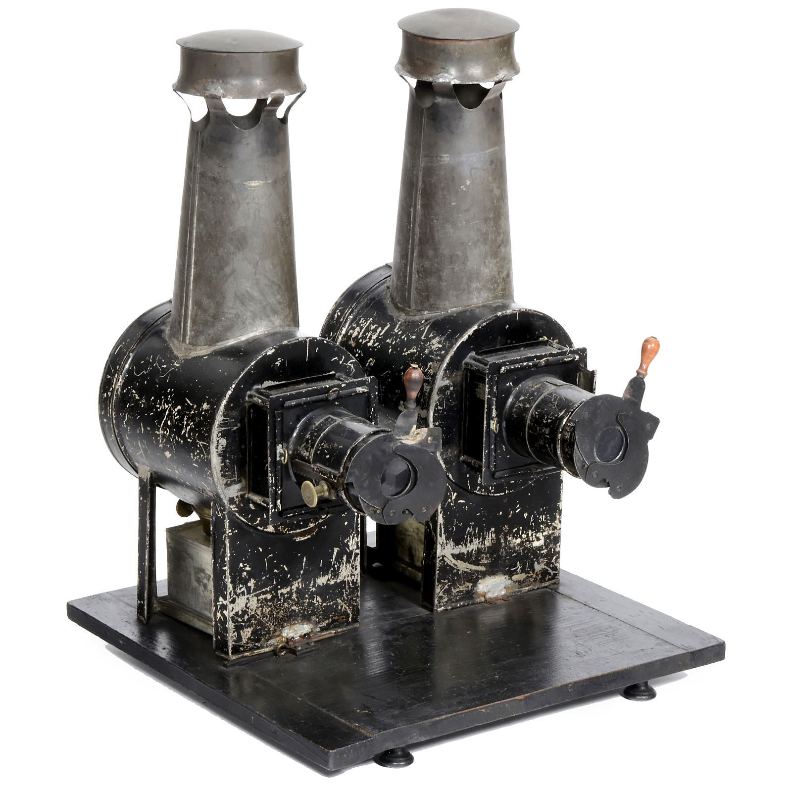 Very unusual tin body lantern, unmarked, for 6 cm (2,35 in.) slides, with both lenses, condensers and original burners, on wooden base 13 x 13,5 in., height 18,5 in.