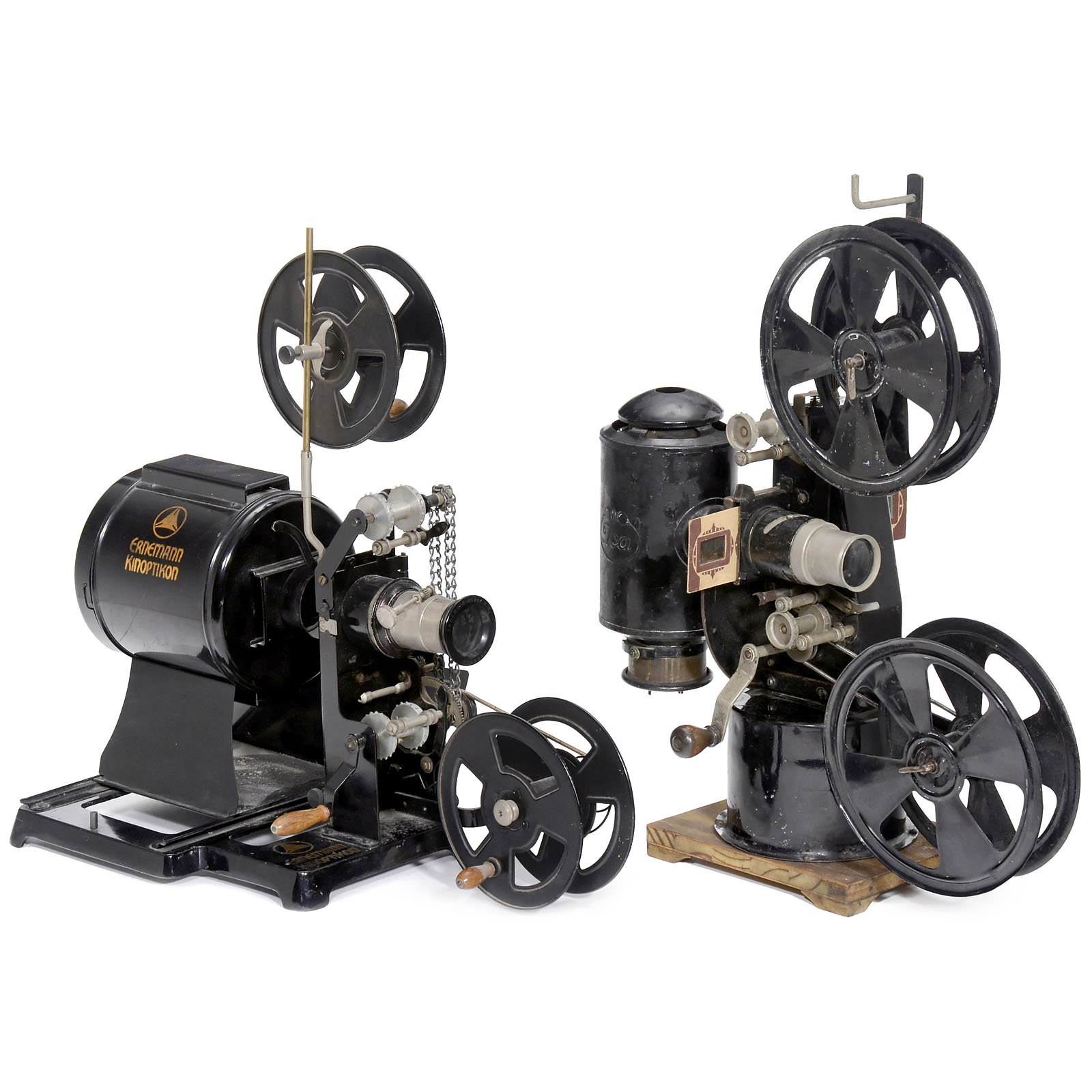 1) Ernemann Kinoptikon, for 30 m spools, hand-cranked, slide projection possible. – And: 2) "Ica Teddy", for 60 m spools, hand-cranked, with the rare Ica Kinamo advertising slide.
