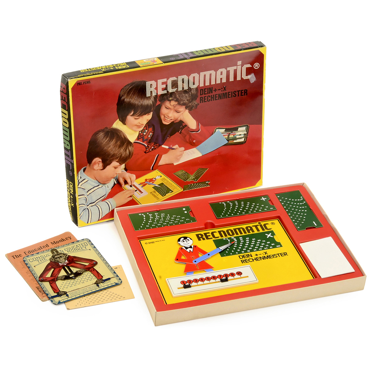 With original manual and cardboard, as well as additional cardboard table. – And: 2) "Recnomatic", 1972. Calculating toy by the Lestrig AG. With original box.