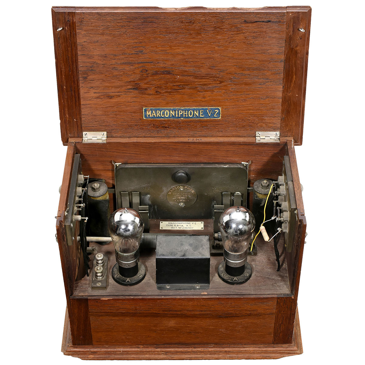 Manufactured by "Marconi's Wireless Telegraph Co.", with 2 DER valves, 340–440 metres plug-in coil, mahogany case, additional opening in back panel, very rare.