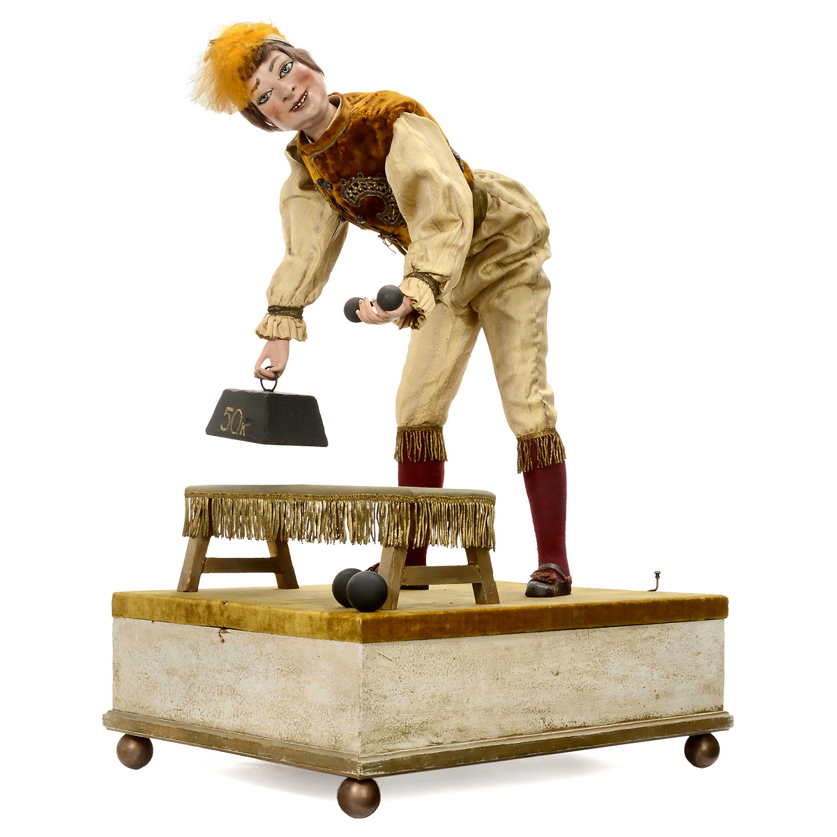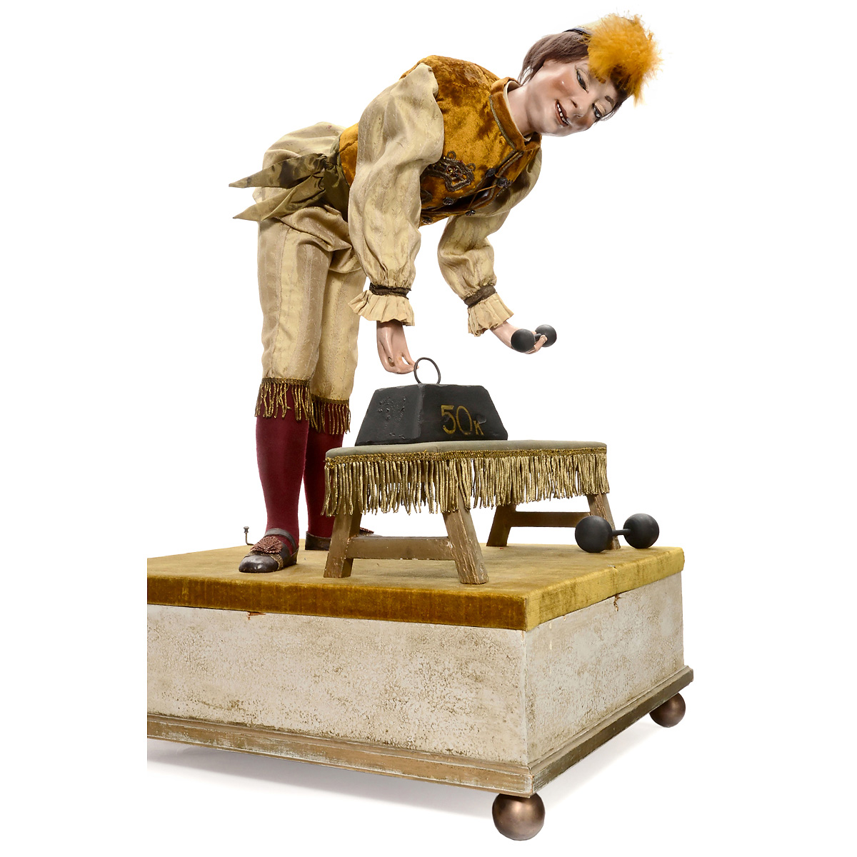 With papier-mâché character head, smiling mouth with parted lips and painted teeth, blue paperweight eyes with articulated eyelids, mohair wig, left hand holding a small dumbbell, right hand outstretched to receive a "50K" weight, articulated left elbow, right arm, head and hips, on painted wood platform base containing going-barrel motor, five brass cams and four-air cylinder musical movement, dressed in theatrical cream silk brocade costume, candy-striped shirt, velvet waistcoat with metallic appliqués, red stockings and feathered hat, ht. lowered 25 ½ in. (65 cm), upright 36 in. (92 cm), restoration and some replacement parts, good working condition. With bone-handled crank-key. – The weight lifter bows from the waist until his upper torso is parallel to the floor, flexes his left arm effortlessly from the elbow and then, as effortlessly, scoops up the "50K" weight in his right hand, straightens up, flexes his left arm again to demonstrate that the large weight is as light for him as the smaller one, turns his head, bends and returns the weight to his bench. He then repeats the performance – this time without the weight! – An automaton designed with great ingenuity to lift and lower a free-standing object. This version of the Weight Lifter was originally the work of Henry Phalibois, the example here probably produced during the period of Gaston Decamps' acquisition of the Phalibois factory stock in 1925. – A rare and dramatic circus-themed automaton.