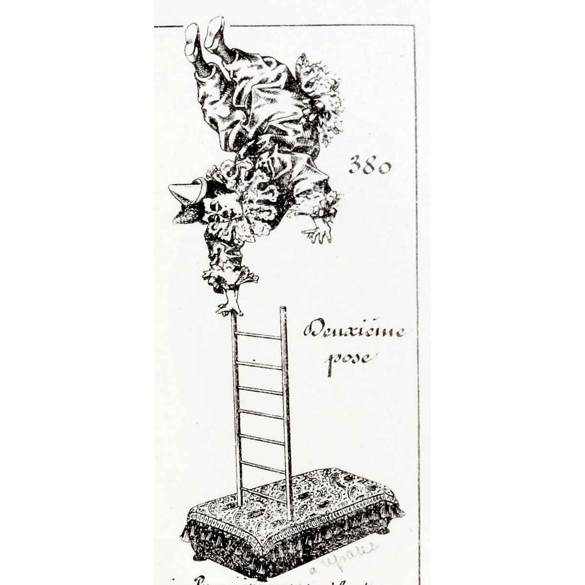 With plaster-composition head, original paint and clown make-up, fixed blue paperweight eyes, mohair wig, original pink satin costume and conical hat, balancing on painted metal ladder on velvet-covered base with printed paisley velvet cover, going-barrel motor and single-air cylinder movement, ht. lowered 24 in. (61 cm) including hat, raised 28 ½ in. (72 cm). With brass Roullet et Decamps stop/start and 7 ½-inch (19 cm) steel key, (minor paint loss). Overall good original working condition. – The clown rises to a handstand position, lowers himself and then rises again, this time lifting his left hand from the ladder so that his body arcs and his legs bend slightly. – Literature: Bailly, "Automata, the Golden Age", p. 132.