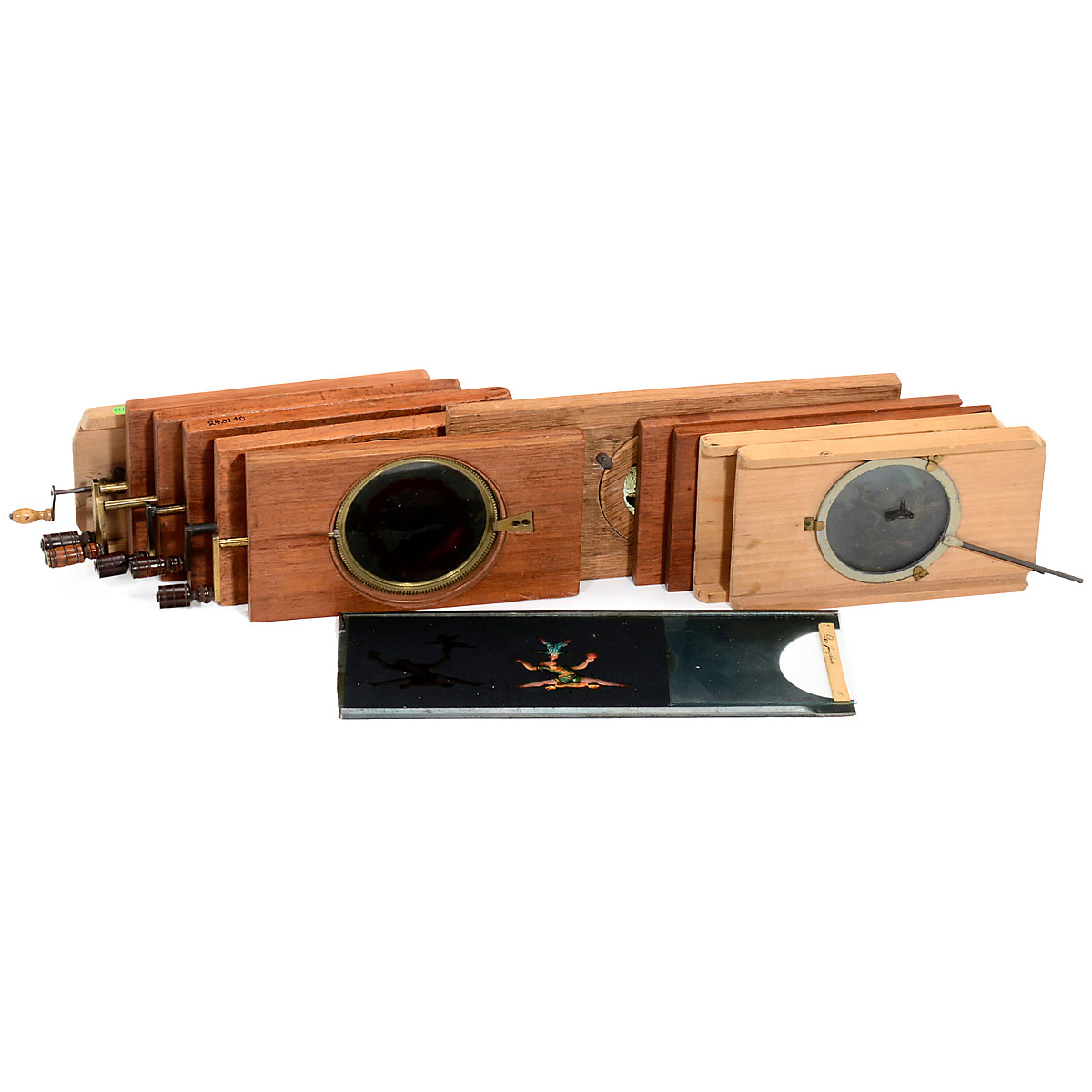 1–5) Presumably England. Single lever slides, sizes 4 x 6 ¼ to 4 x 7 1/9 in., Ø 3 1/6 in., motifs: Vesuvius, magus, waterspout fountain, fishes in an aquarium, mill on the water, all slides hand-painted. – 6) Single lever slides, poplar wooden frame, size 3 ½ x 6 ½ in., Ø 2 1/3 in., motif: angel with a sash "Willkommen" ("Welcome"). – 7–12) Single slipping slides, various sizes (4 x 6 ¾ in., 4 1/3 x 9 7/8 in. and 4 x 10 1/5 in.), some hand-painted slides, motifs: cavalier on stubborn donkey, the loyal horse, cow at stream, deer on the river, the cook at the stove and transformation slide "der Jongleur" (the juggler), in metal frame. – Attractive and amusing collection.