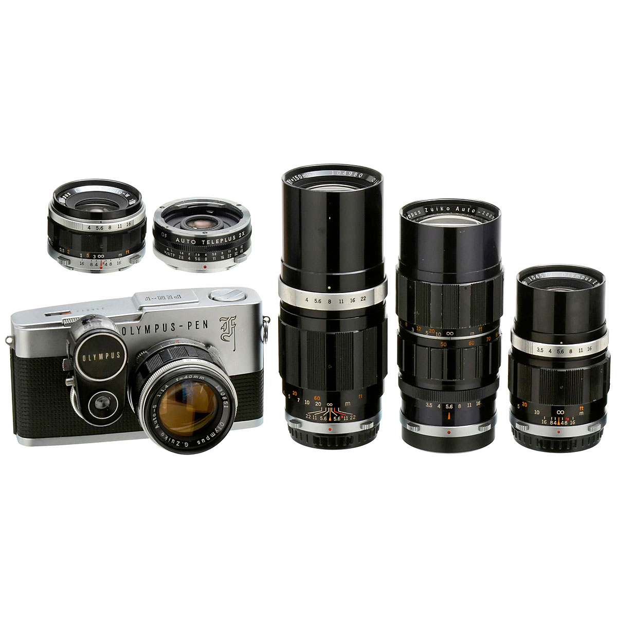 Olympus, Japan. 1) Pen F, eyecup broken, accessory meter, accessory shoe. – 2) G. Zuiko Auto-S 1,4/40 mm, original "F" front cap. – 3) E. Zuiko Auto-W 4/25 mm, front cap. – 4) E. Zuiko Auto-T 3,5/100 mm, both caps. – 5) E. Zuiko Auto-T 4/150 mm, lens hood, both caps. – 6) Zuiko Auto-Zoom 3,5/50–90 mm, filter, both caps. – And: 7) OF Auto Teleplus 2x. – Apertures of some lenses are stuck.