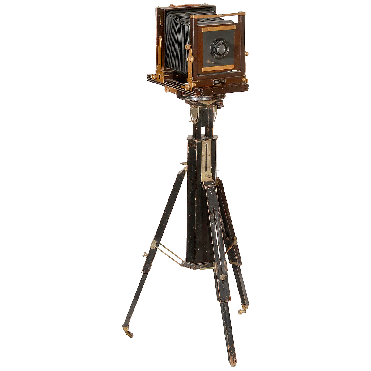 Eastman Kodak, London. Plate size 6 ½ x 8 ½ in., dark polished wood with brass fittings, focusing screen back 3 1/6 x 4 1/3 in., black bellows, Anastigmat 5,6/8 in., with wooden tripod, height of camera with tripod approx. 60 in., with 4 cassettes for plates of 4 ¾ x 6 ¼ in.