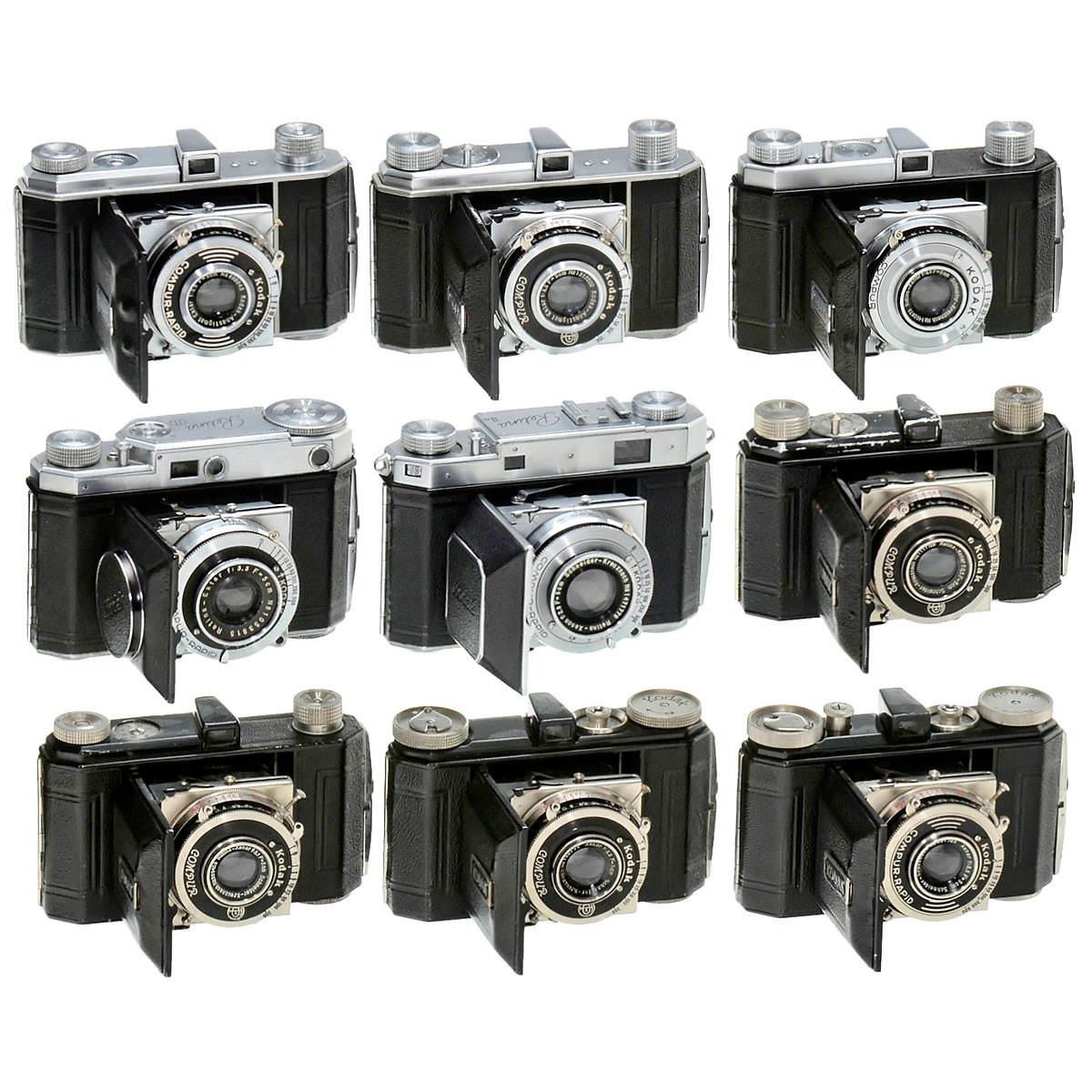Kodak AG, Stuttgart. 1) Retina, no. 117, Xenar 3,5/5 cm in Compur-Rapid. – 2) Retina, no. 118, Xenar 3,5/5 cm in Compur. – 3) Retina I, no. 119, Xenar 3,5/5 cm in Compur. – 4) Retina I, no. 126, Ektar 3,5/5 cm in Compur-Rapid. – 5) Retina I, no. 141, Ektar 3,5/5 cm in Compur. – 6) Retina I, no. 143, Xenar 3,5/5 cm in Compur. – 7) Retina I, no. 149, Xenar 3,5/5 cm in Compur. – 8) Retina II, no. 142, Ektar 3,5/5 cm in Compur-Rapid. – 9) Retina IIa, no. 150, Xenon 2,8/5 cm in Compur-Rapid. – In addition: 4 cases, 3 filters, 1 close-up lens. – Cameras in mixed but generally excellent condition.