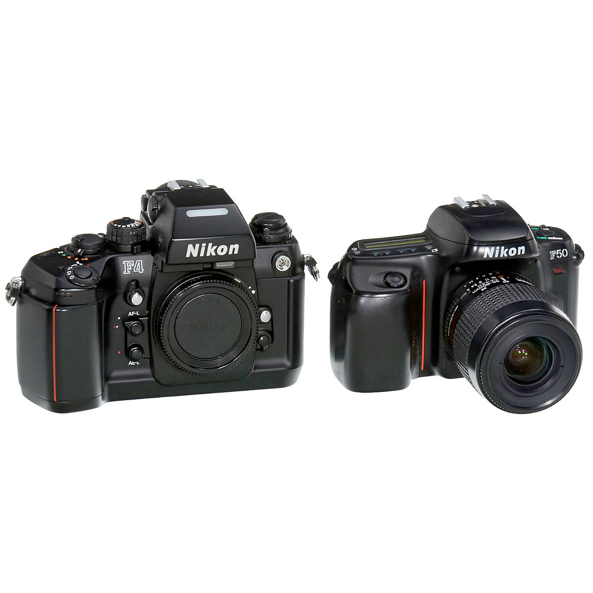 1) Nikon F, chrome, 1973, Nikkor-S Auto 1,2/55 mm (lens interior with fungus). – 2) Nikon EL, no. 5702285. – 3) Nikon FA, with Nikkor 1,8/50 mm. – 4) Nikon F50, with AF Nikkor 35–80 mm. – 5) Nikon F4 body, no. 2170513. – All Cameras untested. – Lenses: 6) Nikkor-UD Auto 3,5/20 mm, no. 465195. – 7) Nikkor-S Auto 1,2/55 mm, no. 224666. – 8) Nikkor 2,8/135 mm, no. 433796. – 9) Zoom-Nikkor 3,5/35–70 mm AI, no. 769079. – 10) Reflex-Nikkor C 8/500 mm, no. 572330. – And: 11) Auto Nikkor Telephoto-Zoom 4–4,5/8,5–25 cm, no. 163631. – In addition: 4 Nikon prism viewfinders (1 x F, 2 x DP-1 and 1 x for F3), bellows "F", 3 angle finders for Nikon F and other parts. – All cameras, lenses and accessories untested.