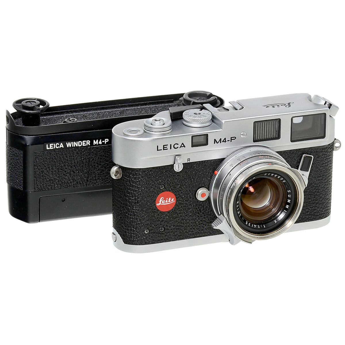 Leitz, Canada. 1) Leica M4-P, no. 1643471, silver-chrome, flush windows, M + X synchronization, with box. – 2) Summilux 1,4/35 mm, no. 2166600, for E41 filters, 2 tiny cement spots. – And: 3) Leica Winder M4-P, with box and instructions.