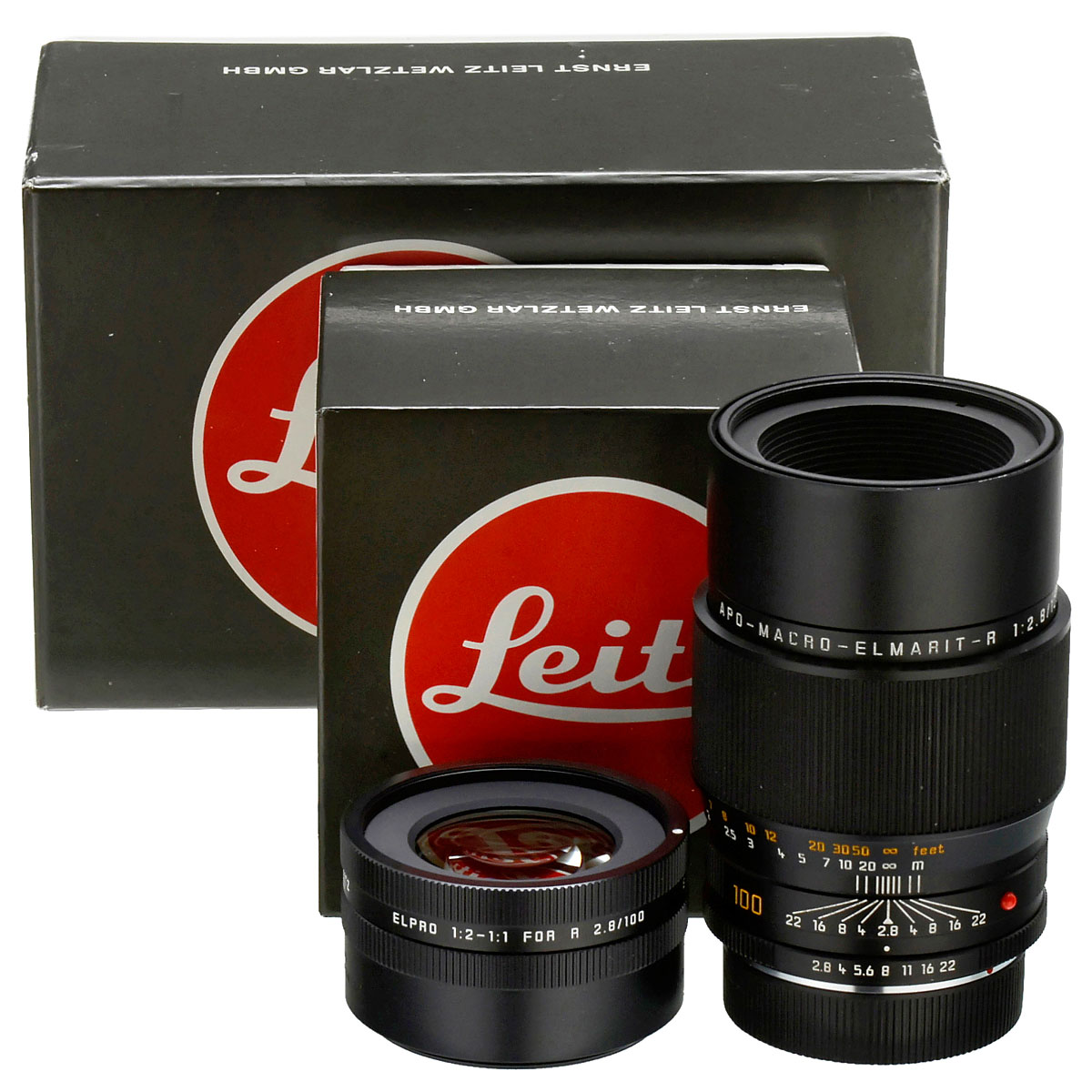 Leica, Solms. 1) APO-Macro-Elmarit-R 2,8/100 mm, no. 3469183, 3-cam, with case, 2 caps and box. (2+/1) – And: 2) Elpro 1:2–1:1, no. 16545, with case, 2 caps and box. New! (1/1)