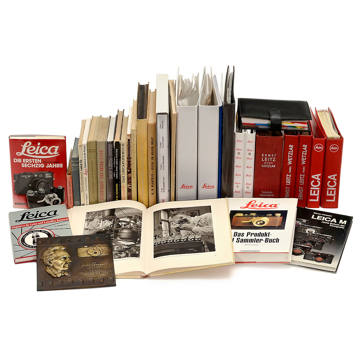 1) Special edition "Festgabe für Ernst Leitz", 1941. – 2) "Ansprachen und Glückwünsche", 1941. – 3) "Ernst Leitz 1849–1949". Aus dem Mitarbeiterkreis. – 4) Rolf Beck, "Die Leitz-Werke in Wetzlar", 1999. – 5) Verena Frey, "75 Jahre Leica Fotografie", 1991. – 6) Dennis Laney, "Leica – Das Produkt- und Sammlerbuch", 1993. – 7) Gianni Rogliatti, "Leica – Die ersten sechzig Jahre", 1986. – 8) G. Rogliatti, "Objektive für Leica und Leicaflex Kameras", 1978. – 9–20) Leica user books by Kisselbach et al. – 21–32) Folders with Leitz catalogs, prospectus, dealer information etc. – In addition: Oskar Barnack bronze plaque.