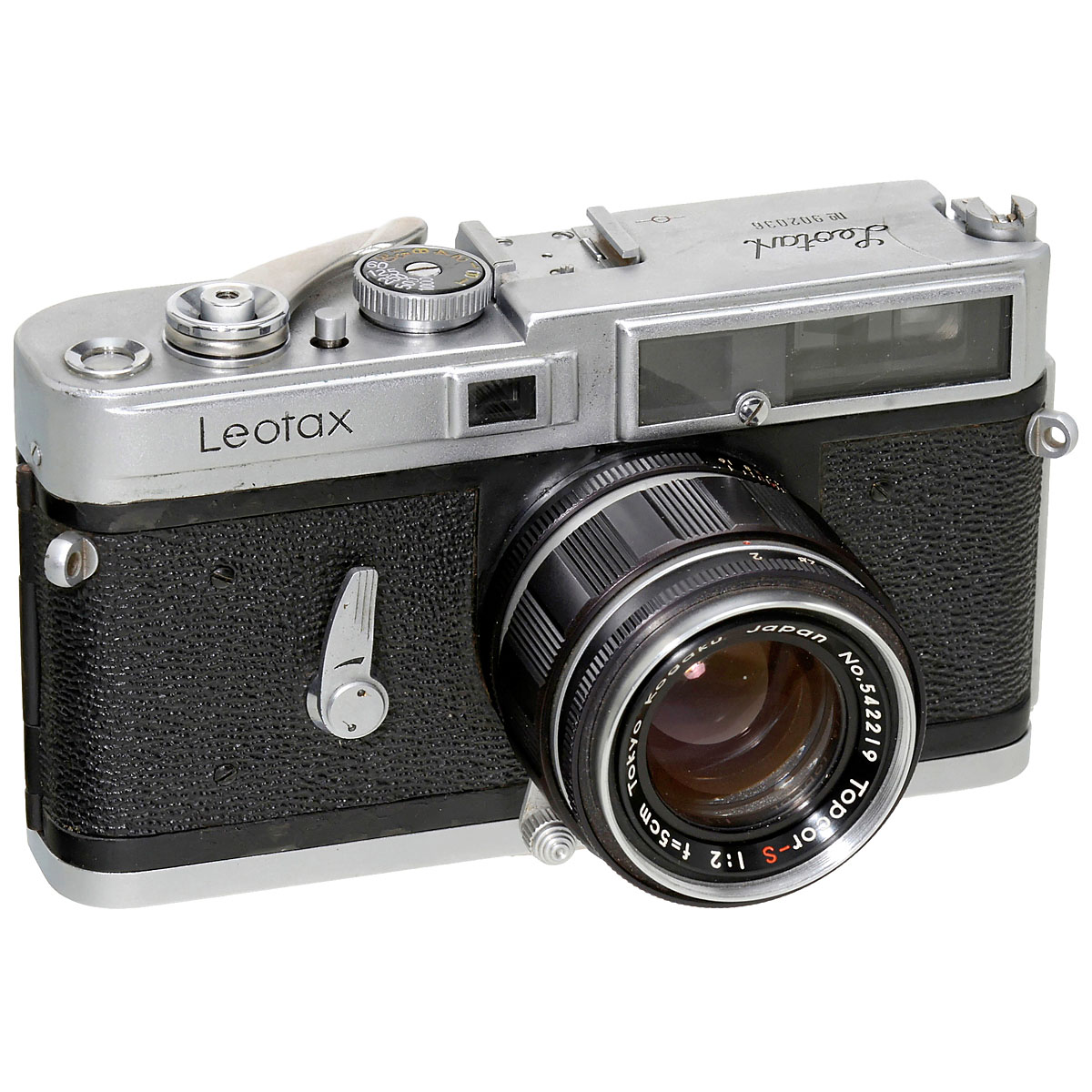 Leotax Camera Co., Japan. No. 902036, rare Leica copy, combination of screw-mount Leica (lens) and Leica M (rapid-wind lever, film counter window), Topcor-S 2/5 cm, meter.