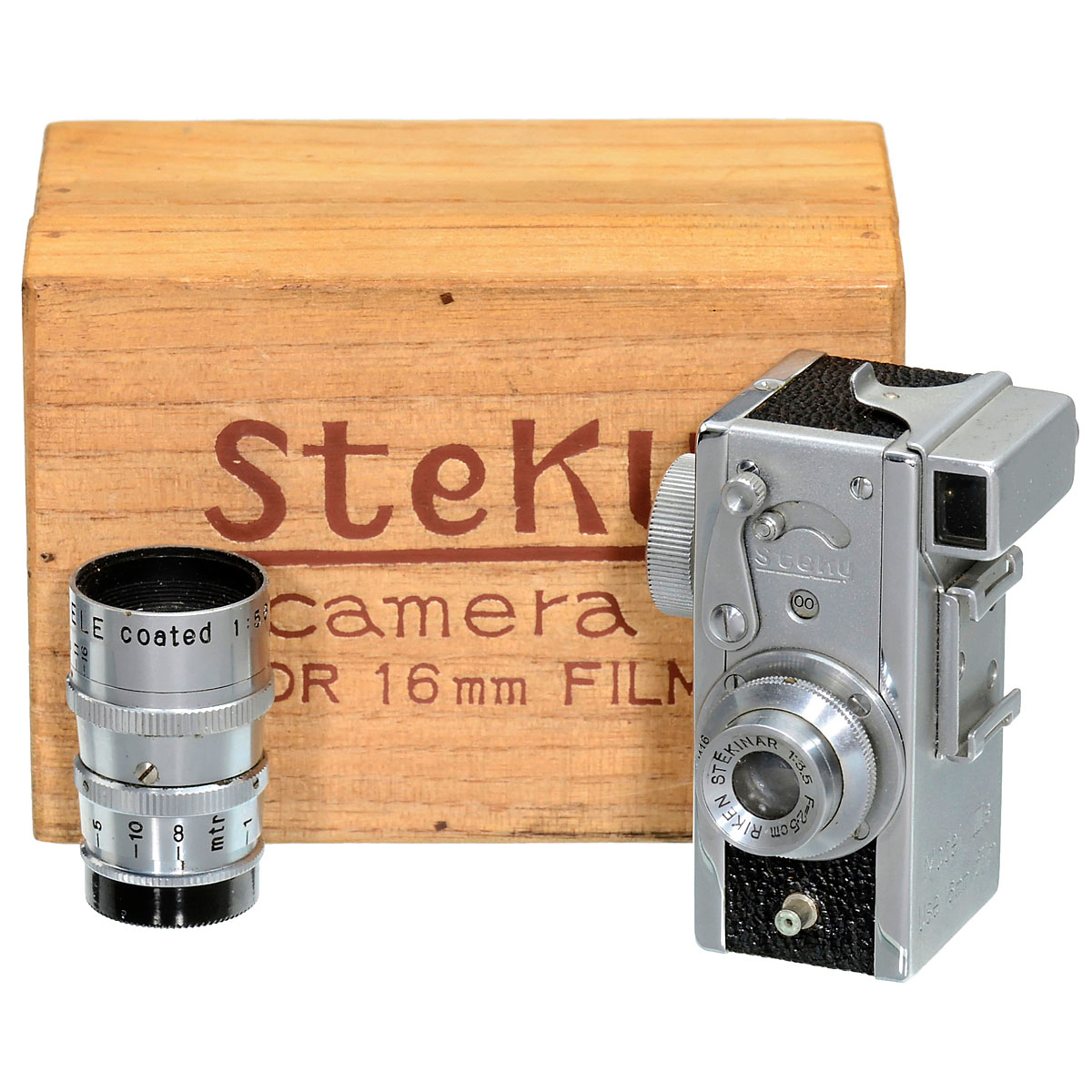 Riken Optical, Japan. No. 16162, 16 mm camera, size 10 x 14 mm, with Stekinar 3,5/2,5 cm and Steky-Tele 5,6/40 mm, shutter 1/25–1/100 sec. With case and original wooden box.