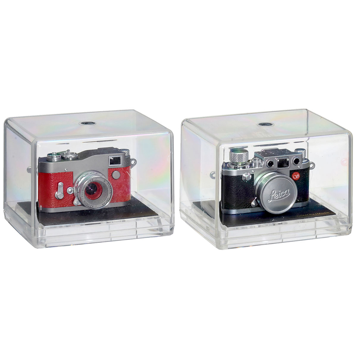 MegaHouse Mini Classic Collection. 1) Leica IIIf, chrome, no. A06091, for Minox film (8 x 11 mm). – And: 2) -B-Sharan (Leica M model), titanium, with red imitation leather, marked "MSIR No. 20/33", presumably only 33 cameras produced, for Minox film. – With 2 display boxes.