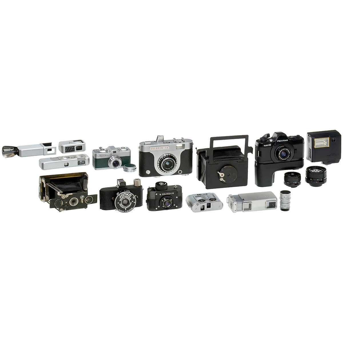 1) Minox, Minox III, 1951, with selenium meter, electronic flash ME1, AG1 flash B. – 2) Concava, Tessina L, 1960. – 3) Meopta, Mikroma II, 1959. – 4) Goldammer, Goldeck 16, model 81, 1959. – 5) Houghtons, Ensignette No. 1, new flag in circle, 1911. – 6) Junka, Junka, 1937. – 7) Ernemann, Liliput, 4,5 x 6 cm, celluloid focusing screen, 1914. – 8) Krasnogorsk, F-21 electronic, 1980. – 9) Minolta, Minolta 16, model II, 1960. – And: 10) Asahi, Pentax auto 110 Set, 1979, 3 lenses, electronic flash, winder. – In addition: Riken, Steky-Tele 5,6/40 mm. – Cameras in mixed condition, mostly working.