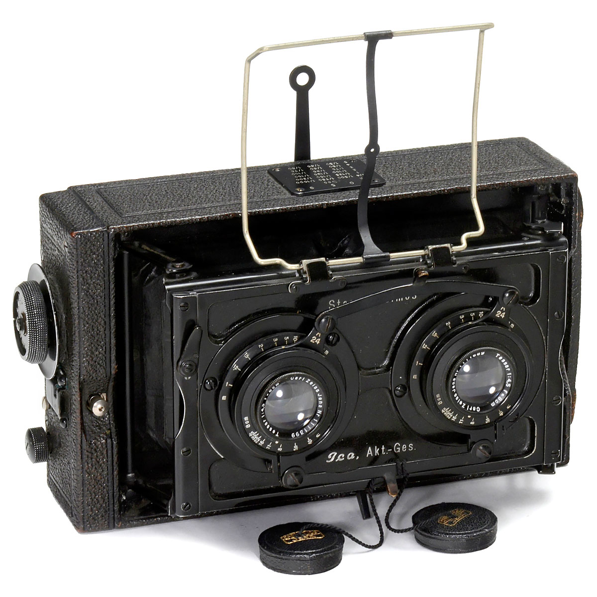 Ica AG, Dresden. Strut-folding stereo camera for plates of 6 x 13 cm, lenses: Carl Zeiss Jena Tessar 4,5/8 cm, iris diaphragms 4,5 to 45, focal plane shutter Z, B 1/30–1/1000 sec. (shutter needs attention), focusing 1 m to inf., folding frame finder.