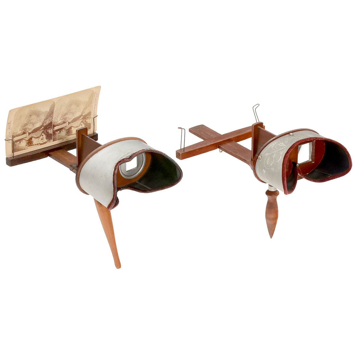 1) Unmarked, stamped: "Pat. April–Sep. 1897", stereo viewer from aluminum and wood for cards of 9 x 18 cm, prismatic oculars, focusable. (3+/2) – And: 2) Unmarked, stamped: "Pat. Mai 03 – Oct. 04", stereo viewer from aluminum and wood for cards of 9 x 18 cm, prismatic oculars, focusable, with stereo card. (3/2)
