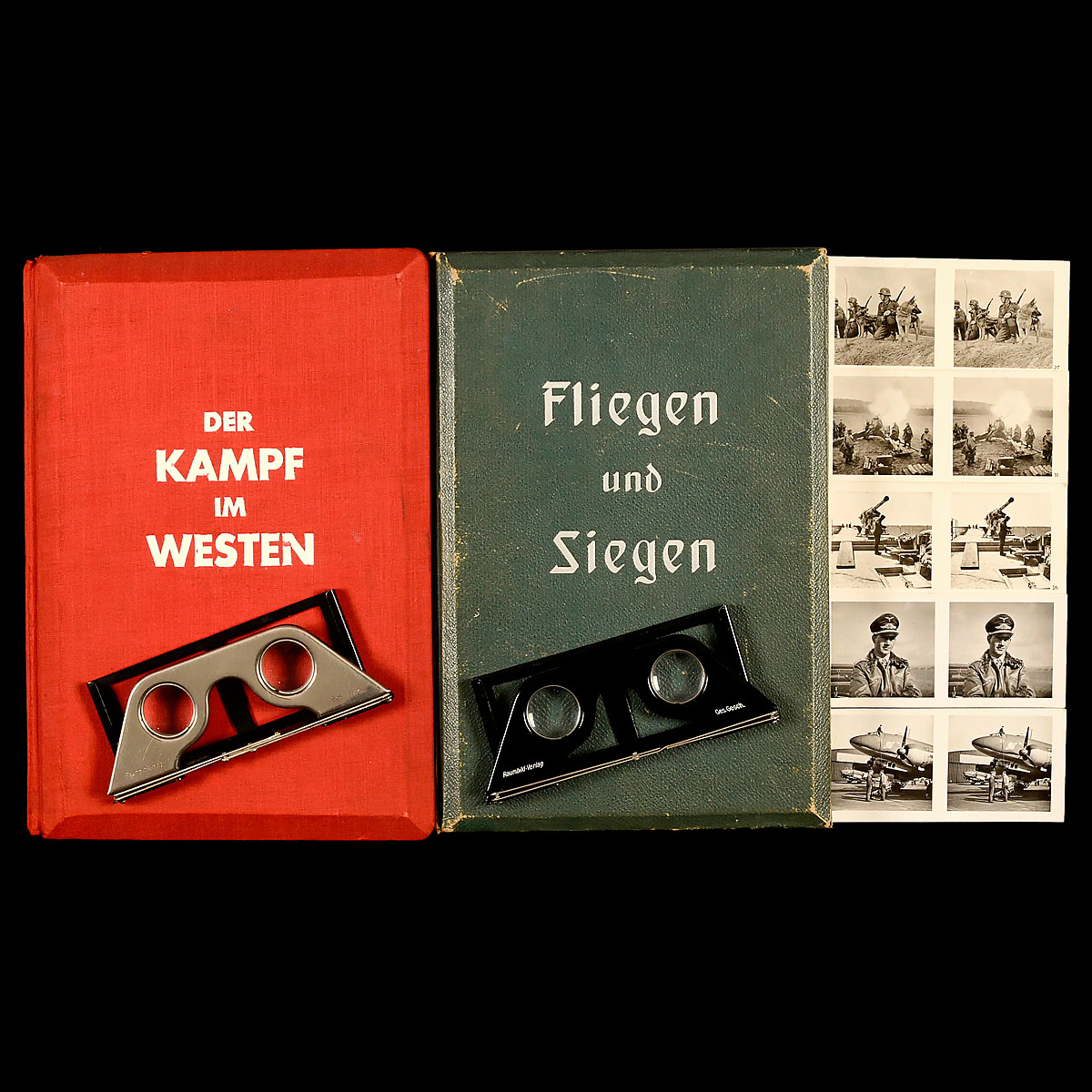 Raumbild-Verlag Otto Schönstein. 1) "Der Kampf im Westen", 1940, complete with 100 pictures and stereo viewer. – And: 2) "Fliegen und Siegen", 1942, complete with 100 pictures and stereo viewer.