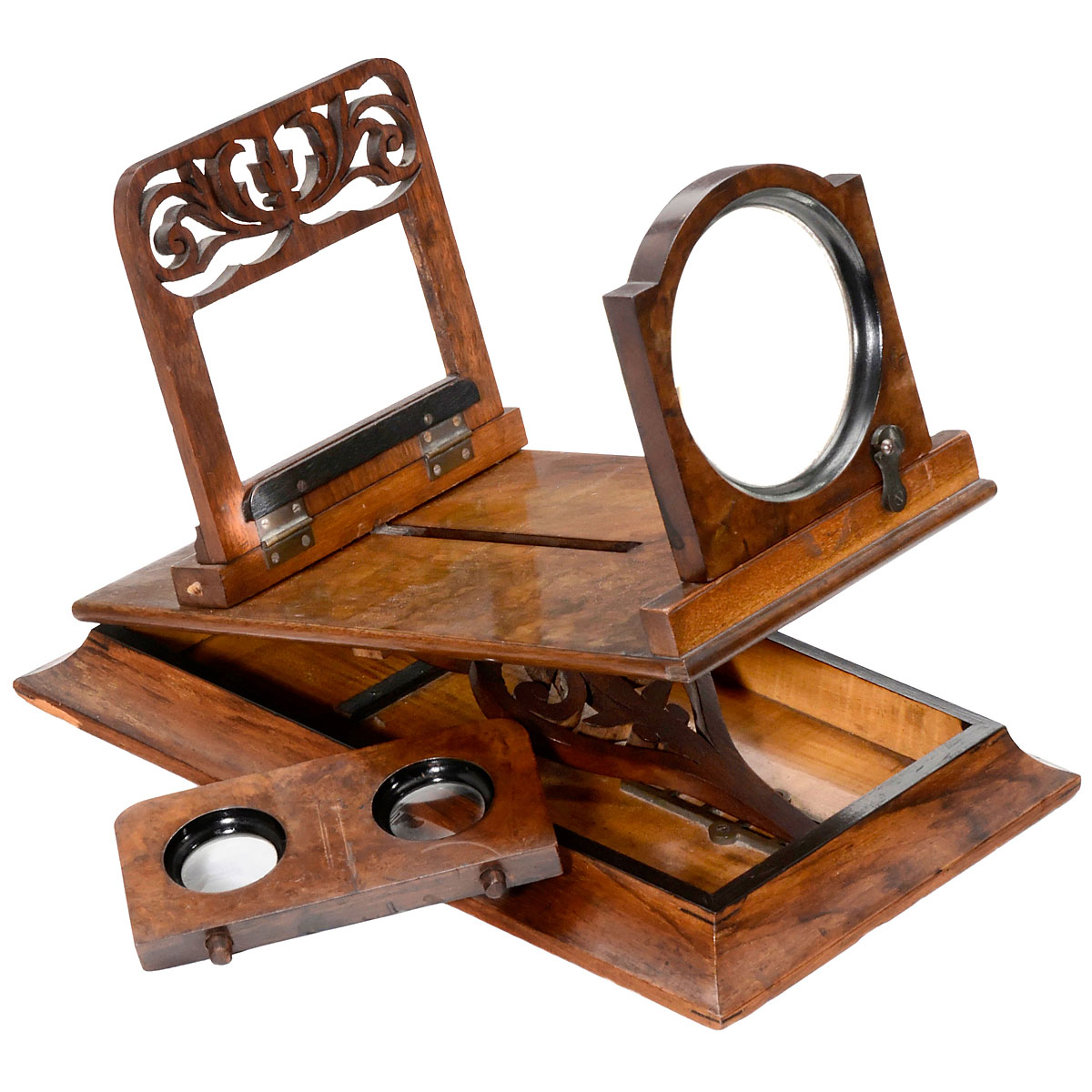 Presumably Rowsell, England. Polished wood, interchangeable loupes for stereo cards of 9 x 18 cm and pictures, loupe Ø 4 in., oculars Ø 1 ½ in., height of the viewer 14 1/5 in.