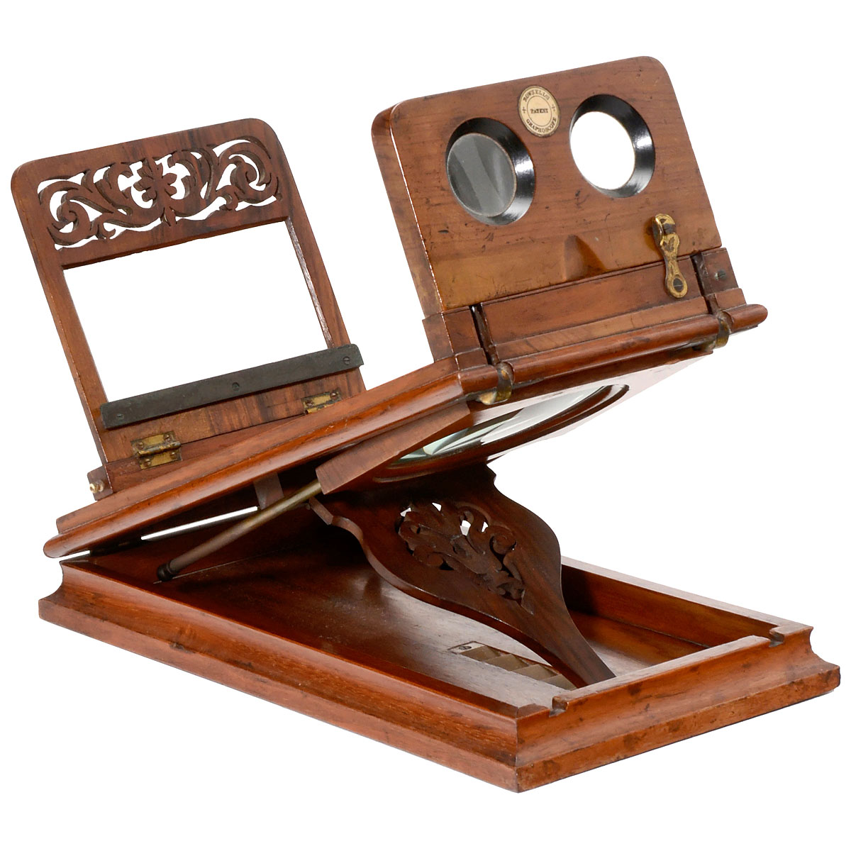 Rowsell, England. Early stereo graphoscope, polished wood, lens Ø 4 ¾ in., oculars 1 3/5 in., for stereo cards of 9 x 18 cm and other formats, height of the viewer 20 ½ in. – Rare stereo viewer!