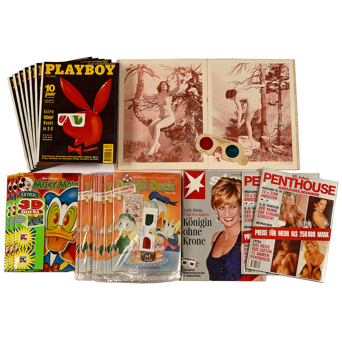 1) 7 x Playboy, 1993, Dutch, with anaglyphs. – 2) "Nus Académiques", c. 1920, anaglyphs. – 3) 3 x Mickey Mouse, 1999, German, with stereo images. – 4) 2 x Penthouse, 1995, German, anaglyphs. – 5) Stern, 1995, German, anaglyphs. – And: 6) 16 x Donald Duck, 1993, Dutch, anaglyphs. – All images with viewers.
