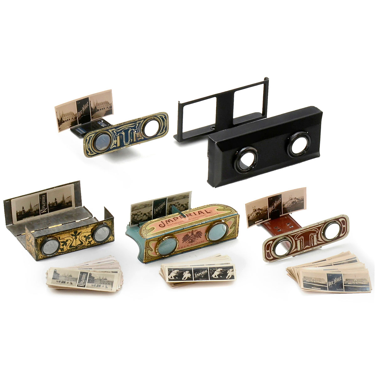 1) NPG Steglitz. "Imperial", small lithographed viewer with 25 stereo pictures of 3 x 7 cm "Imperial", with box. – 2) Unmarked, presumably NPG, "Kolibri", stereo viewer with 30 stereo pictures of 3 x 7 cm. – 3) Unmarked strut stereo viewer for stereo cards and slides of 4,5 x 10,5 cm, box. – And: 4–5) 2 small metal stereo viewers (red and blue) for stereo cards of 3 x 7 cm, 1 x marked "Fulmina", with 27 stereo cards "Der Harz".