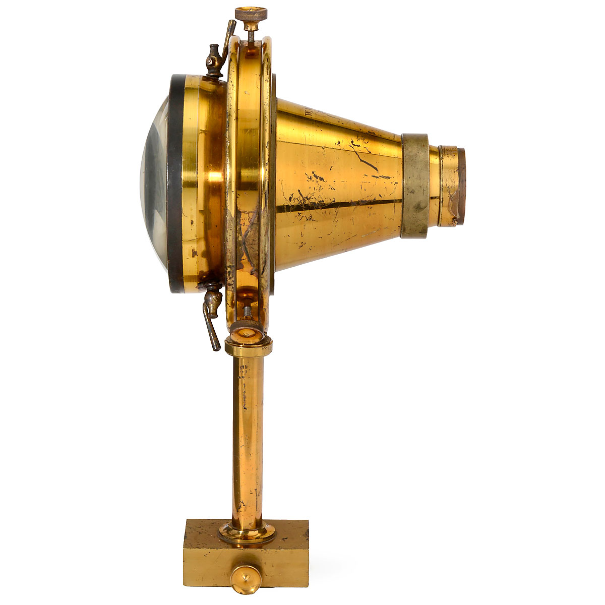 W. Watson & Sons, 313 High Holburn, London. This special lens had to be filled with distilled water. Height (with bench way lens standard in minimum position) approx. 34 cm. Diameter front lens approx. 115 mm, diameter rear lens approx. 35 mm, iris diaphragm behind the rear lens. The most well-known liquid filled lens, the so-called "Liquid Panoramic Lens" by Thomas Sutton (1859) was filled with two absolute symmetric lenses. Earlier (1852) it was Frederick Scott Archer, who constructed the so-called "Liquid Lens", consisting of two meniscus lenses and filled with diluted acid. This lens is also consisting of two lenses, from which the bigger one shows nearly 4 times the diameter of the smaller one.
