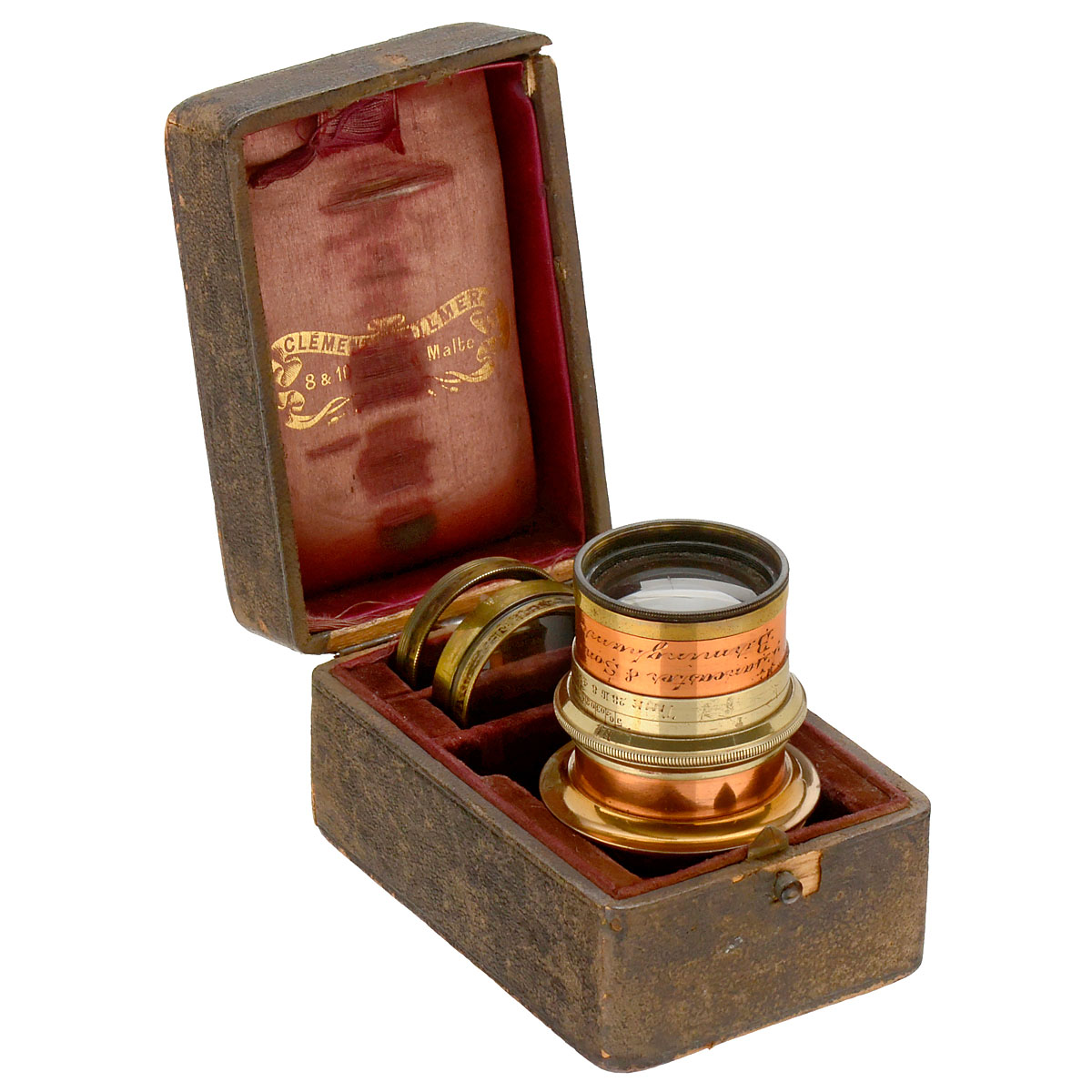 Attractive lens with a focal length of approx. 23 cm. Equipped with iris diaphragm. Height: approx. 57 mm. With 2 lens elements (not fitting). In Clément & Gilmer case.