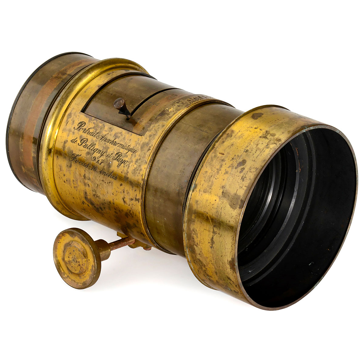 A soft focus lens for so-called artistic portraits built by Darlot, Paris, according to the ideas and design of two famous French "pictoralist" photographers: Puyo and Pulligny. Two symmetrical meniscus lenses with iris diaphragm made a more or less soft focus portrait in pictoralistic style. Height approx. 205 mm, focal length 16 in., front lens Ø approx. 78 mm. With lens cap "Sold by A.F. Staley & Co., London E.C.".