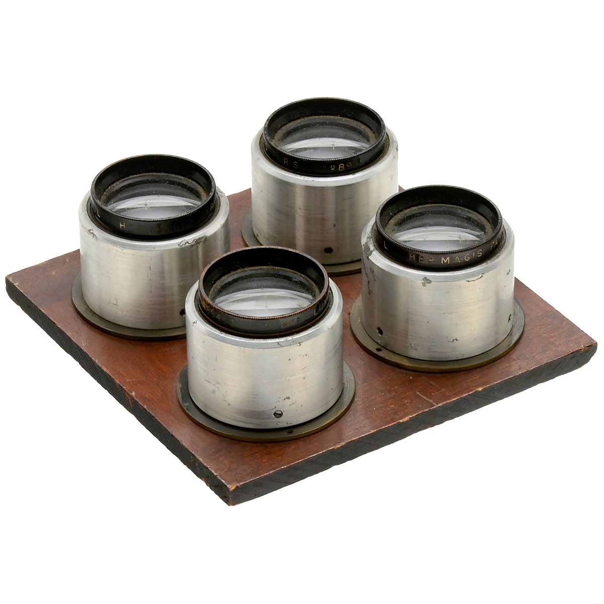 France. 4 lenses with 8 cm focal length, lenses without diaphragm, lens board approx. 4 ½ x 4 ½ in.